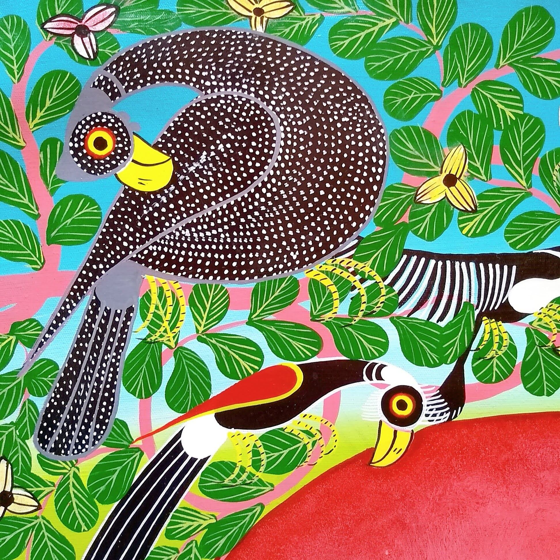 東アフリカ、タンザニアのポップアートです。主にアフリカの動物や植物、人々や風景、精霊などがモチーフとなり、エナメルペンキで描かれています。名前は創始者のエドワード・サイディ・ティンガティンガの名に因んでいます。