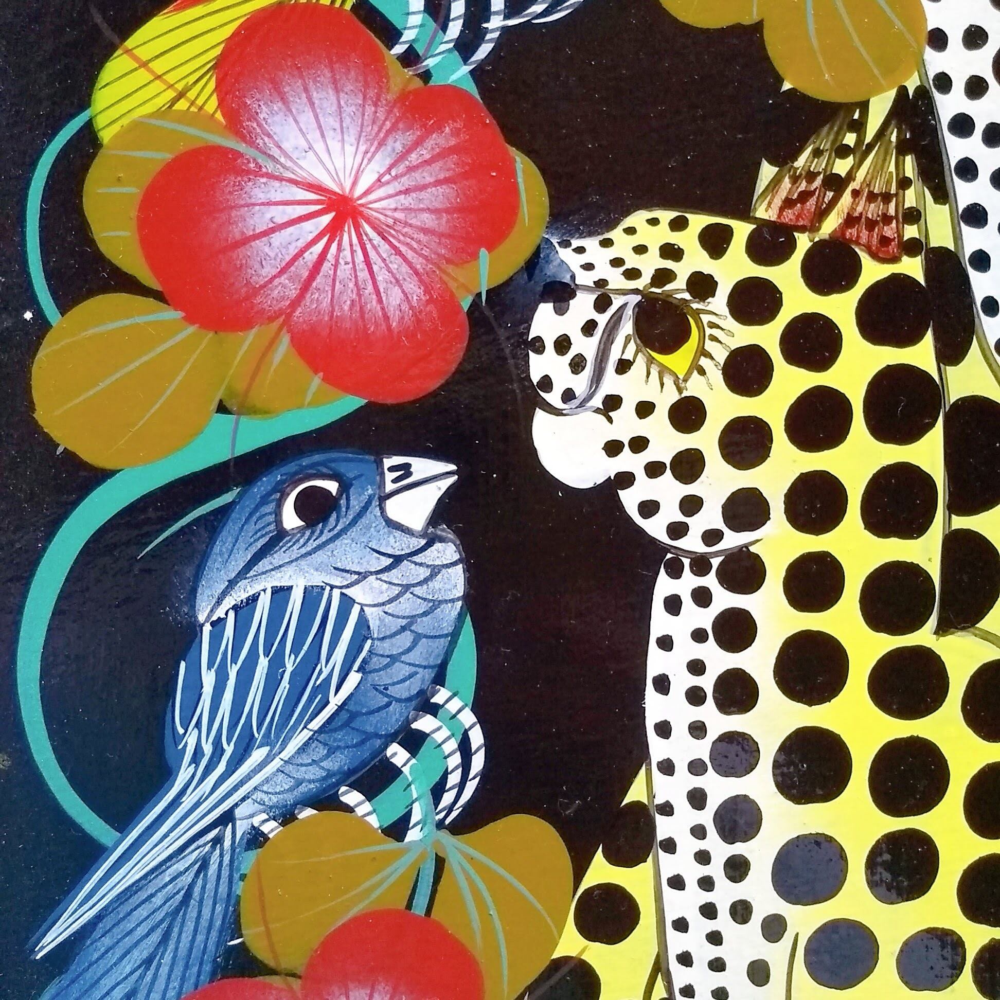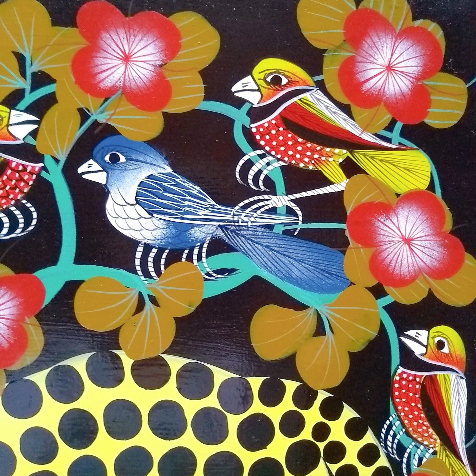 東アフリカ、タンザニアのポップアートです。主にアフリカの動物や植物、人々や風景、精霊などがモチーフとなり、エナメルペンキで描かれています。名前は創始者のエドワード・サイディ・ティンガティンガの名に因んでいます。