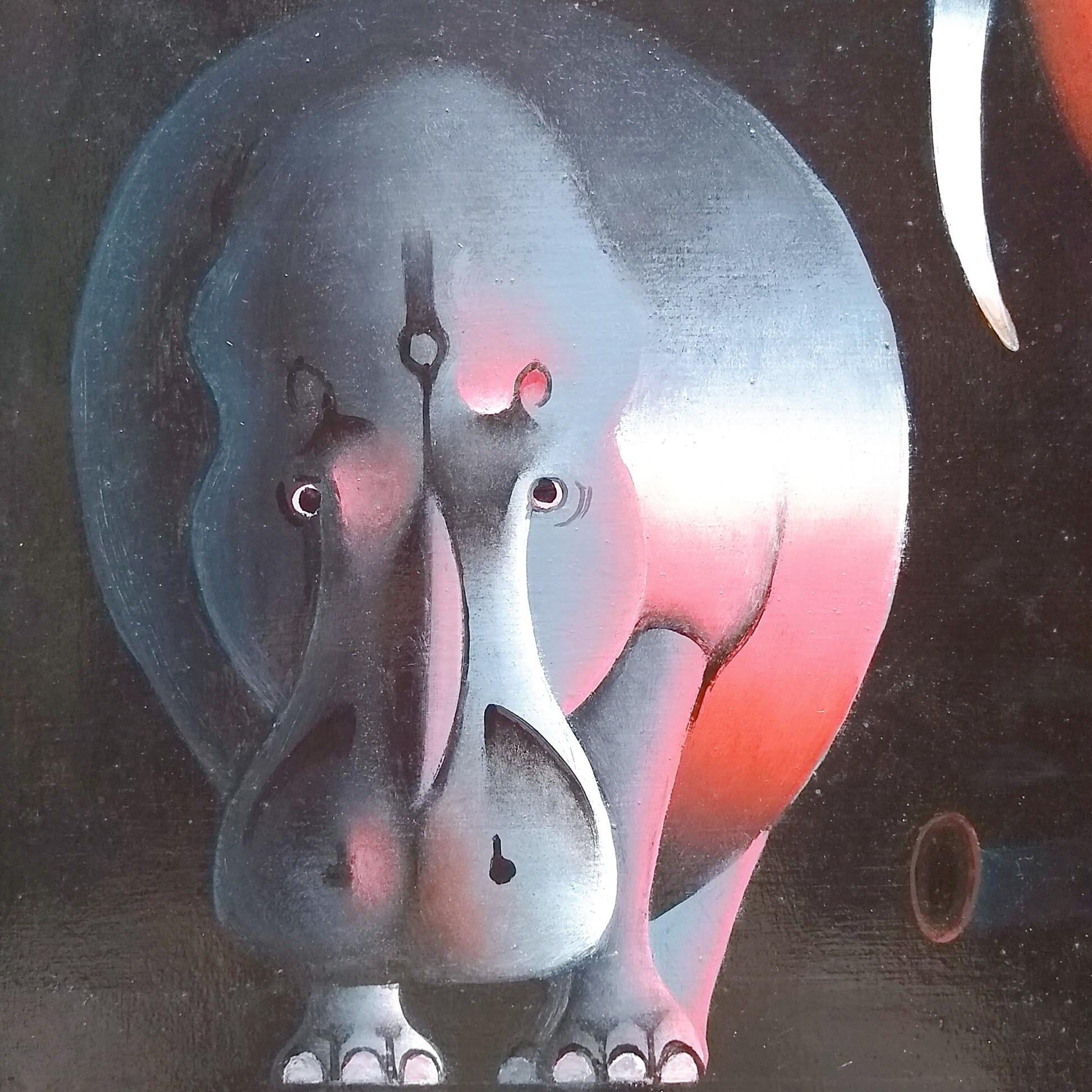 「闇夜の中から鋭い目でこちらを見つめるゾウとカバ。こちらに何かを訴えかけているようです。」