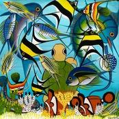 「ウミガメにエンジェルフィッシュにクマノミにカジキマグロ…あれ?イルカのしっぽがお魚?フグのしっぽになんか生えてる?!間違い探しが楽しめるかも(笑) お手頃サイズで小さな額にも入ります。」