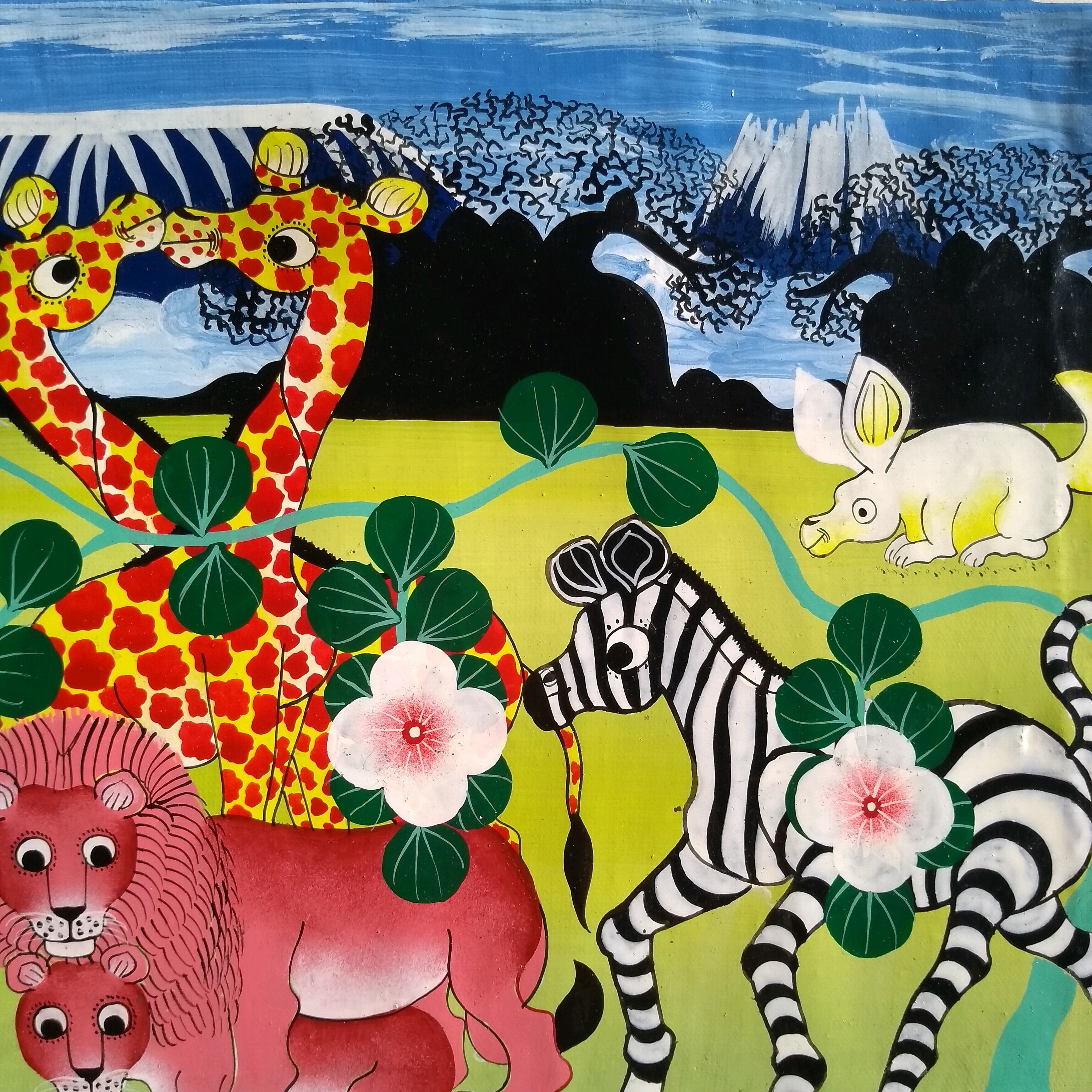 ※ なるべく状態の良いものを仕入れていますが、色ムラ、ペンキの跳ね、ひび割れやしわなどがある場合がございます。赤道直下の太陽の下で創作活動に励む作家たちに思いを馳せて、味わいとして鑑賞していただけると幸いです。