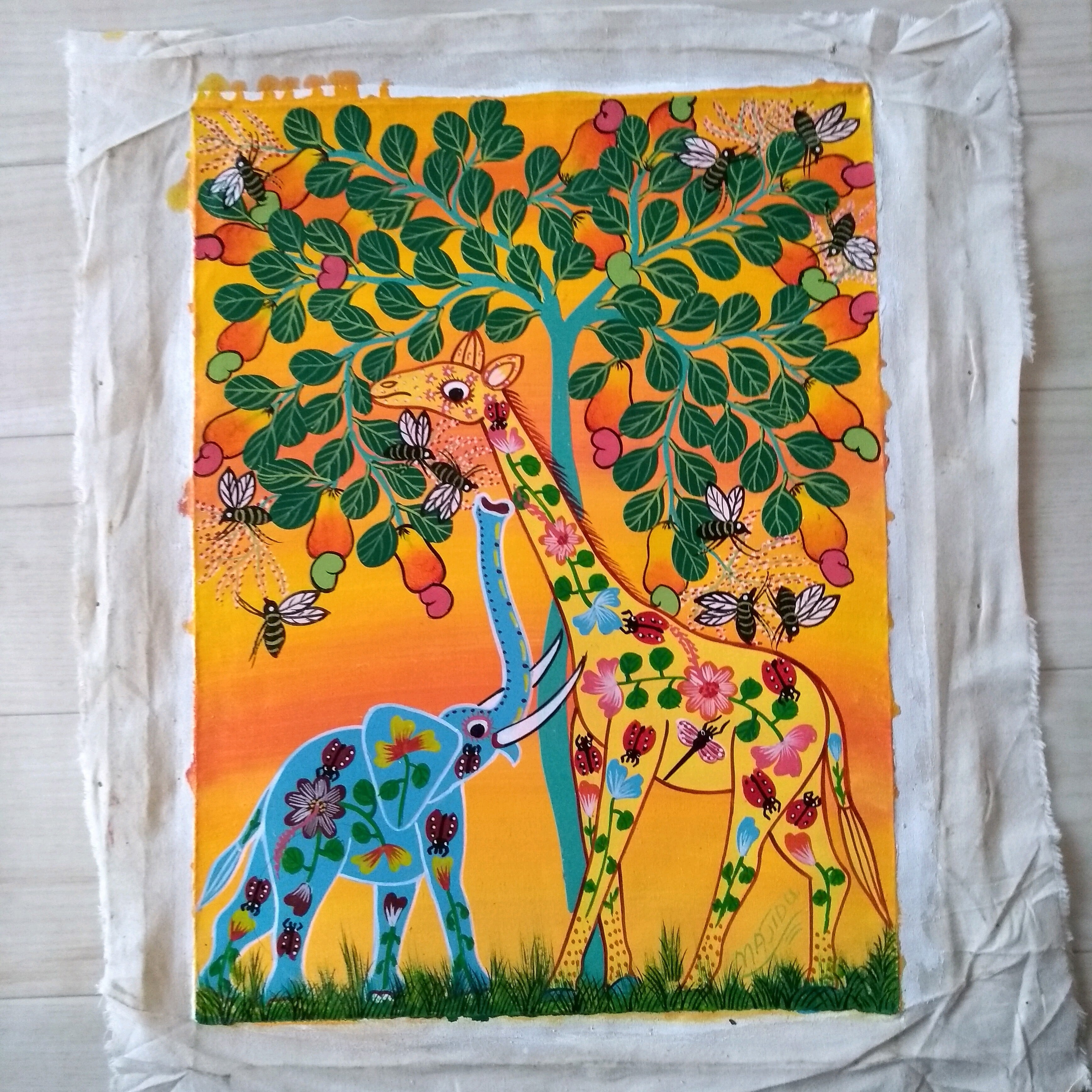 『 Floral Tembo and Twiga 』Medium-Tingatinga by Majidu 40*30cm