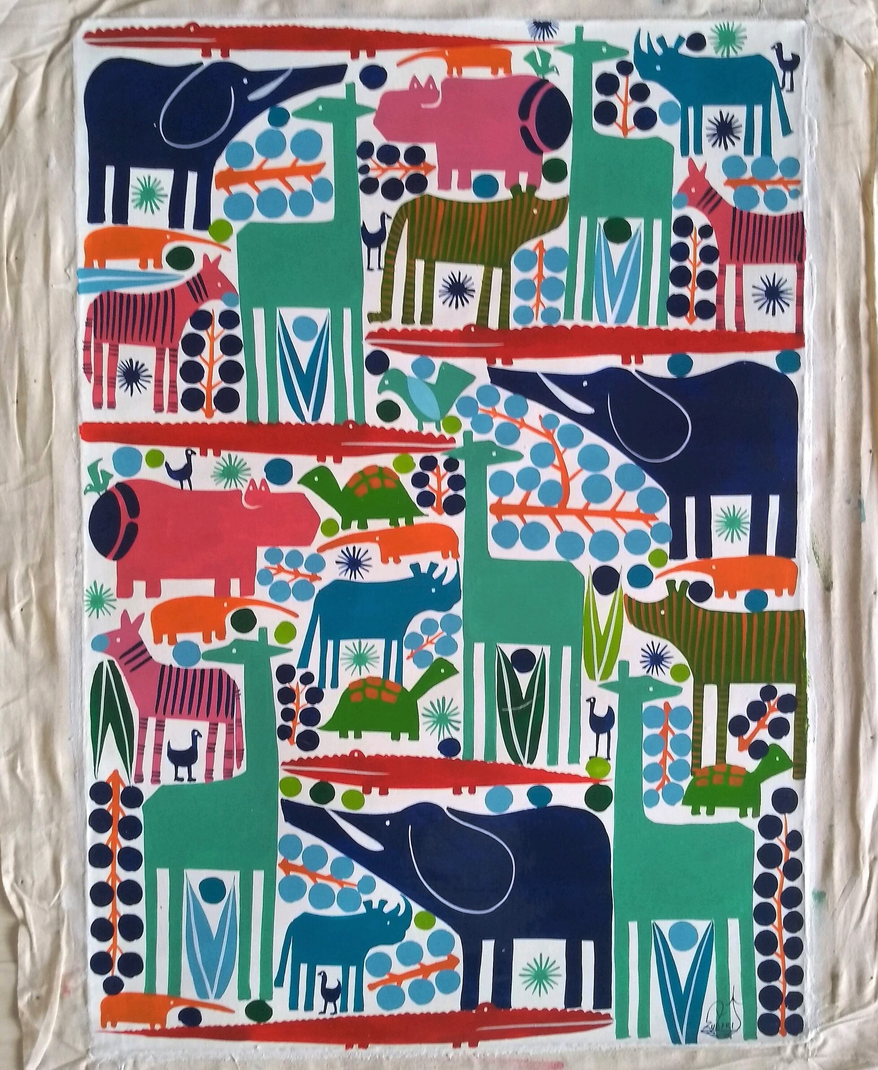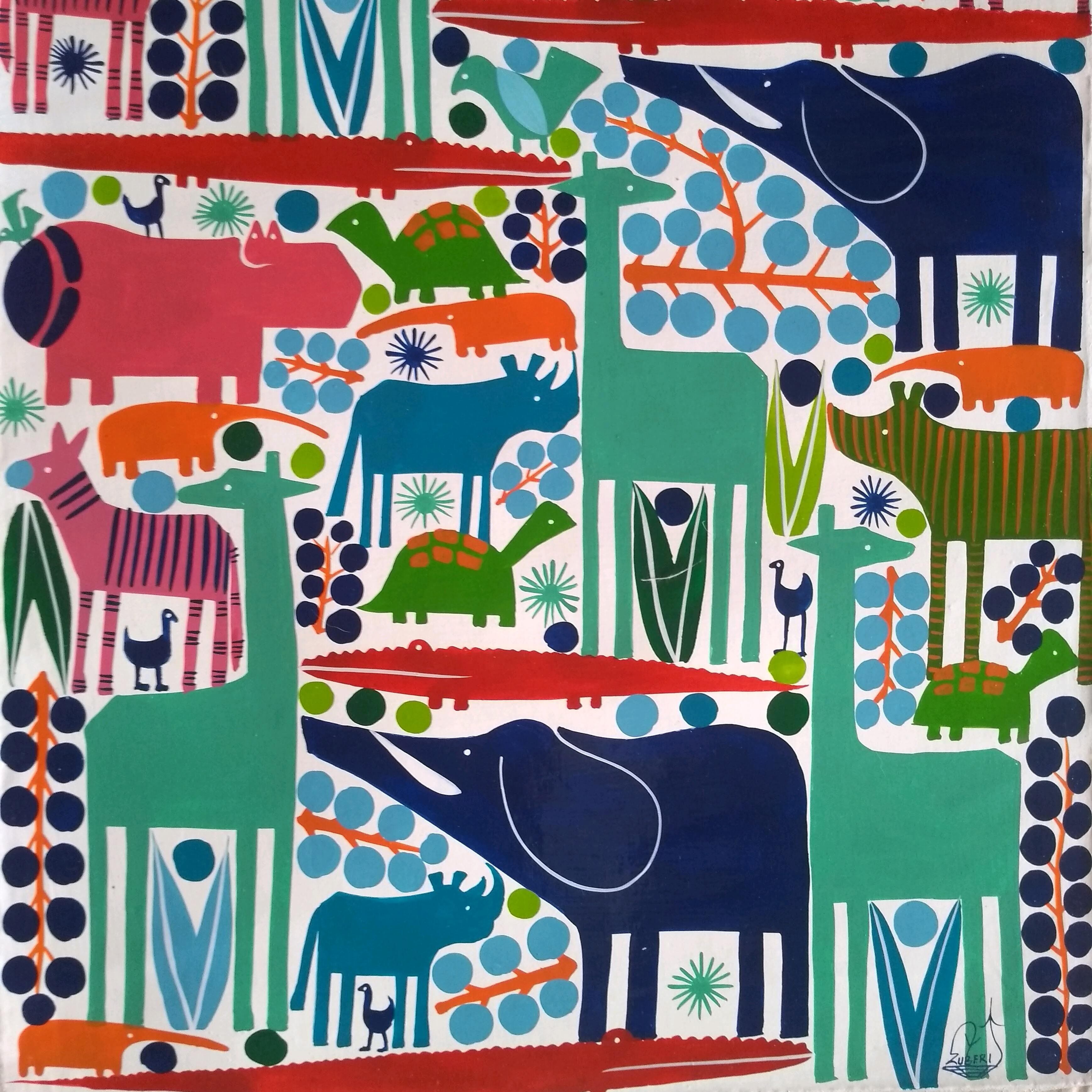 ■アーティスト : ズベリ(ティンガティンガビレッジを代表する人気画家のひとりです。オリジナリティあふれる構図が得意。独特の色感覚が魅力的です。)
