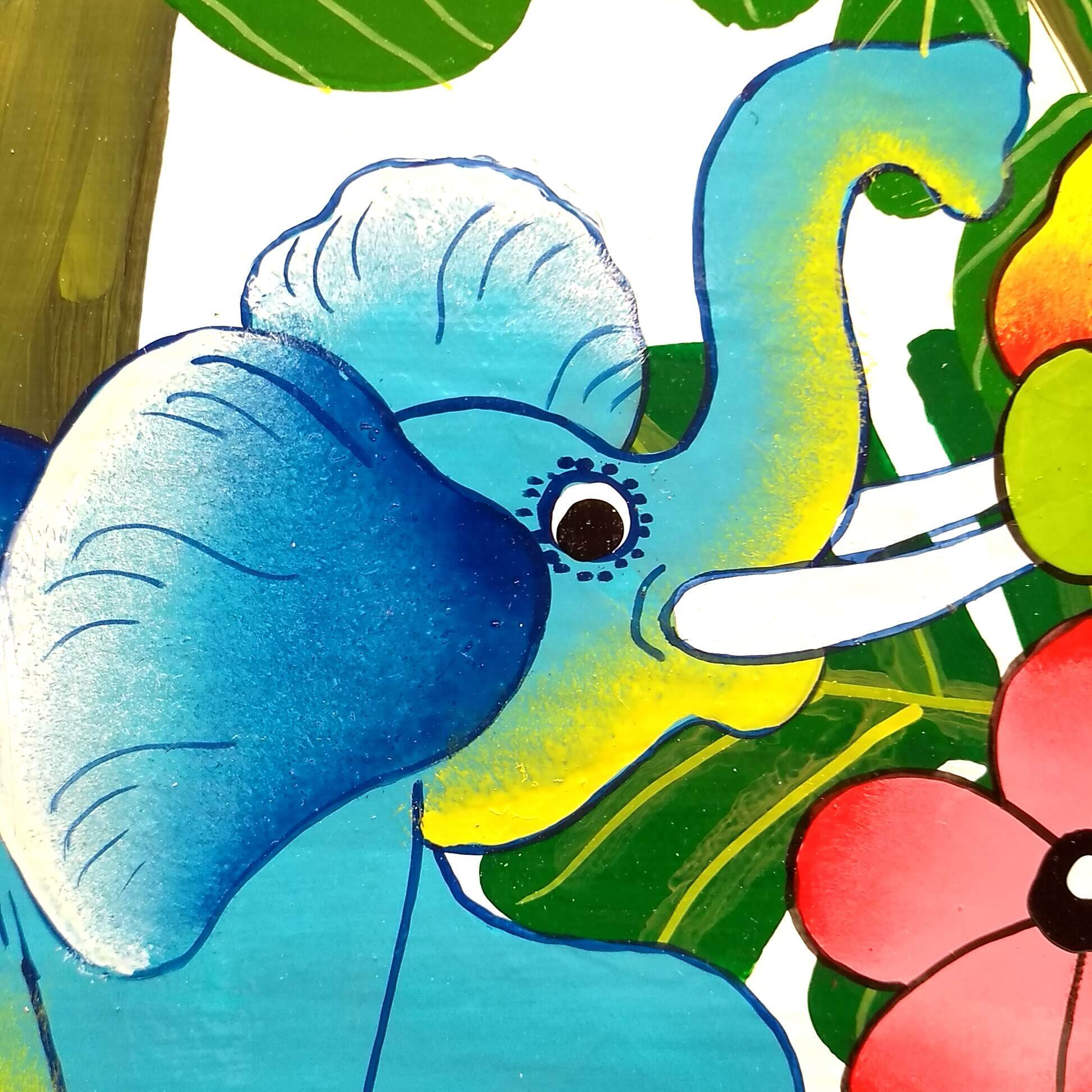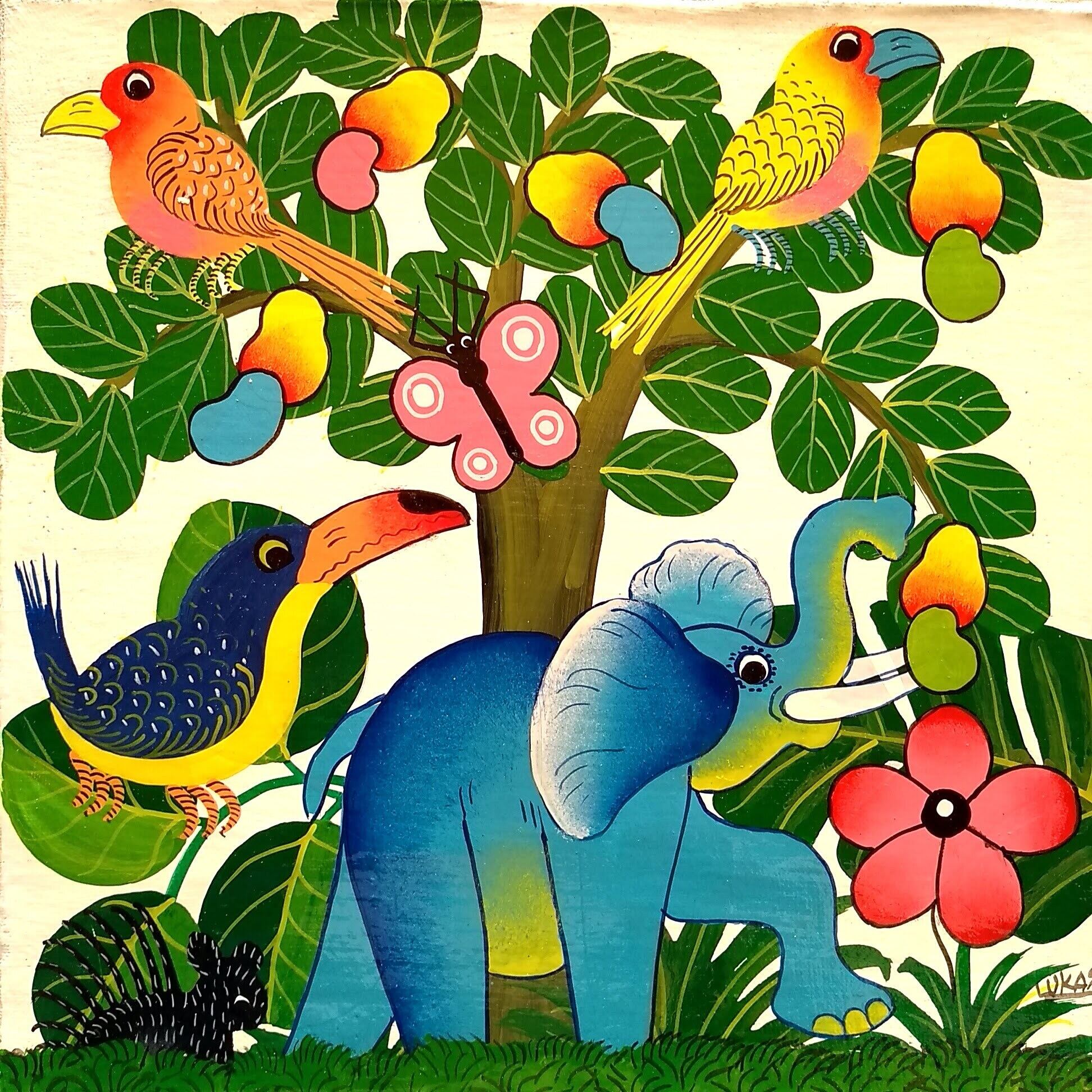 『 Tembo and cashew in white 』Small-Tingatinga by Lukas 20*20cm