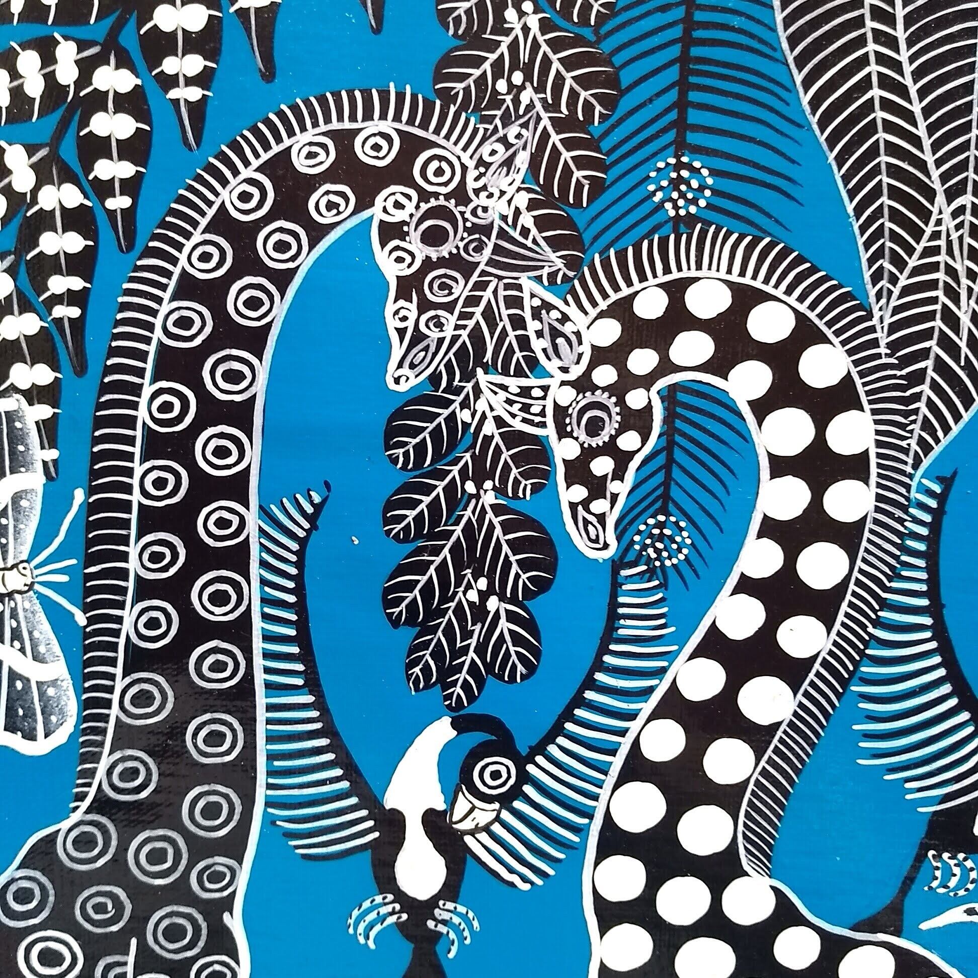 東アフリカ、タンザニアのポップアートです。主にアフリカの動物や植物、人々や風景、精霊などがモチーフとなり、エナメルペンキで描かれています。名前は創始者のエドワード・サイディ・ティンガティンガの名に因んでいます。