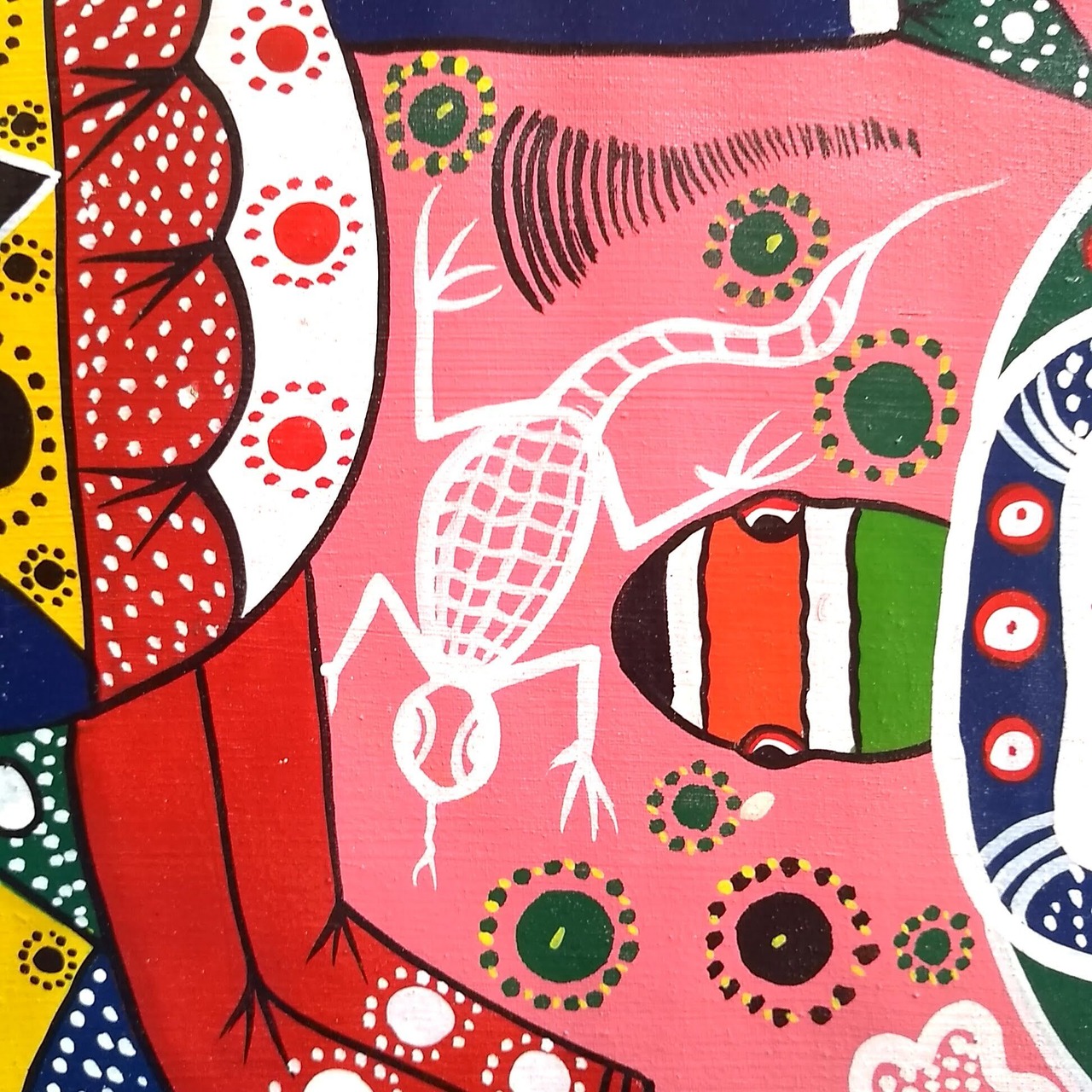 ※ なるべく状態の良いものを仕入れていますが、色ムラ、ペンキの跳ね、ひび割れやしわなどがある場合がございます。赤道直下の太陽の下で創作活動に励む作家たちに思いを馳せて、味わいとして鑑賞していただけると幸いです。