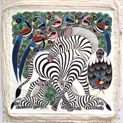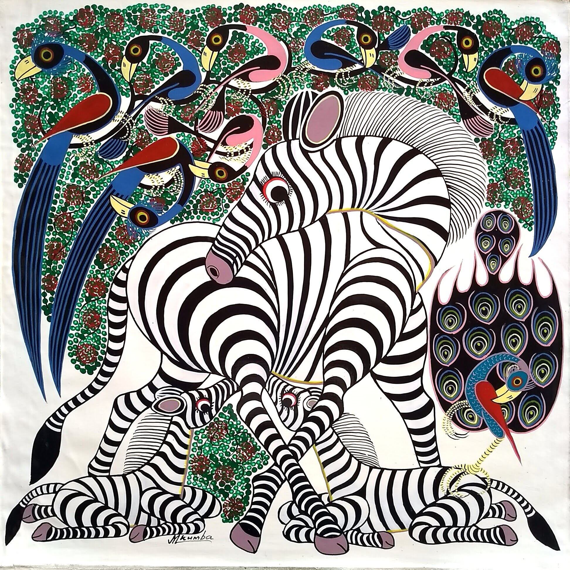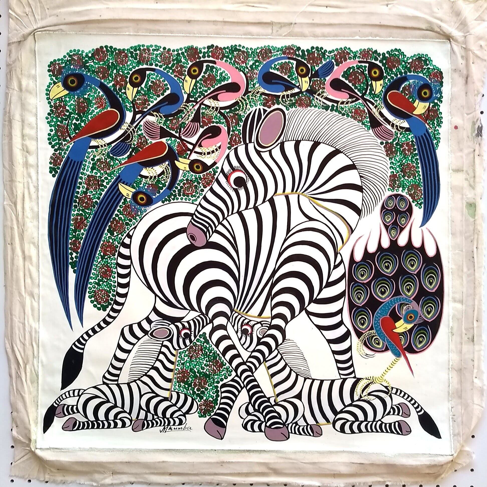 「中央にシマウマのママとミルクを飲む赤ちゃんたち。それを取り囲む鳥たち。まんまるのおめめでこちらを見つめるキュートな作品です。」