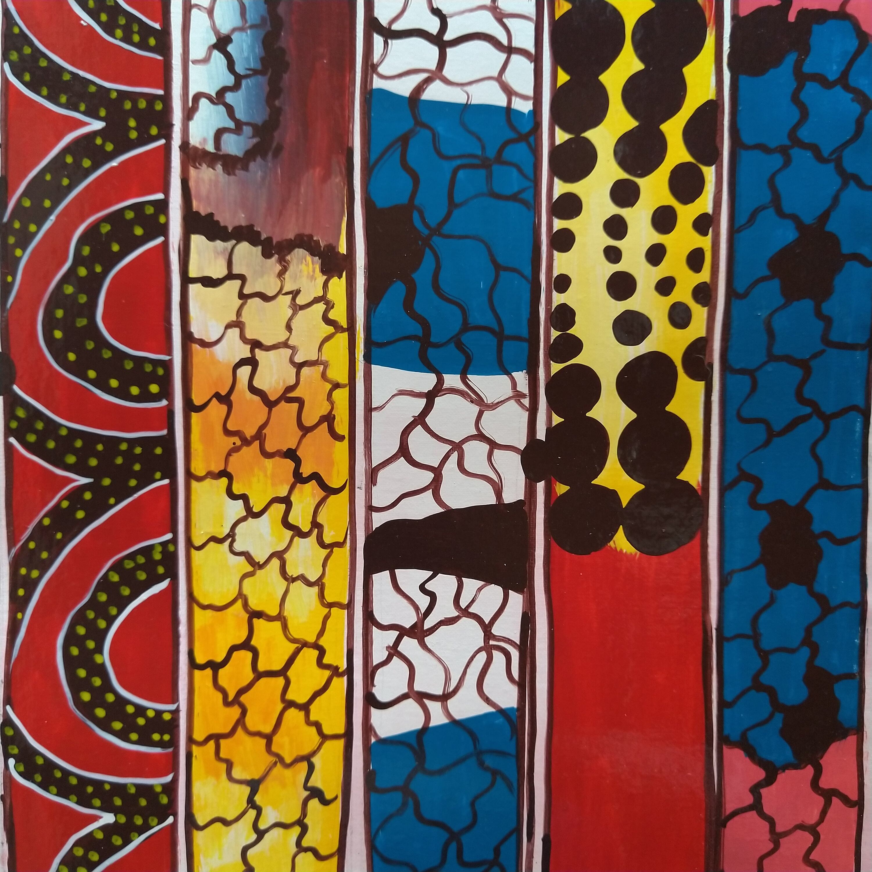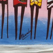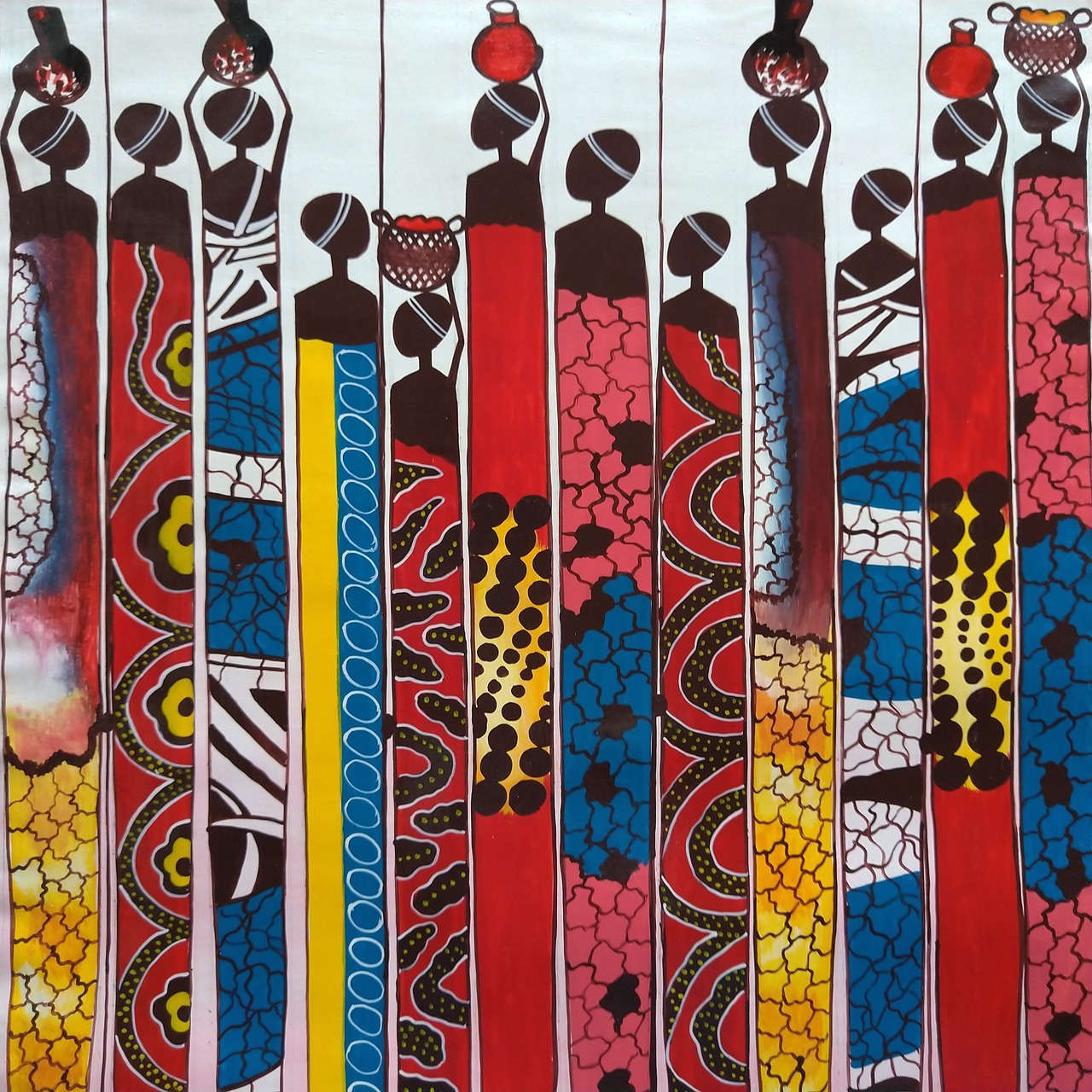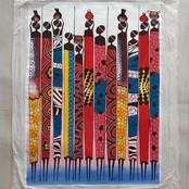「かわいらしい動物の作品が得意なムクンバさんのスタイリッシュな一枚。それぞれの服の柄は実際にある伝統布を再現していて美しく見ごたえがあります。」