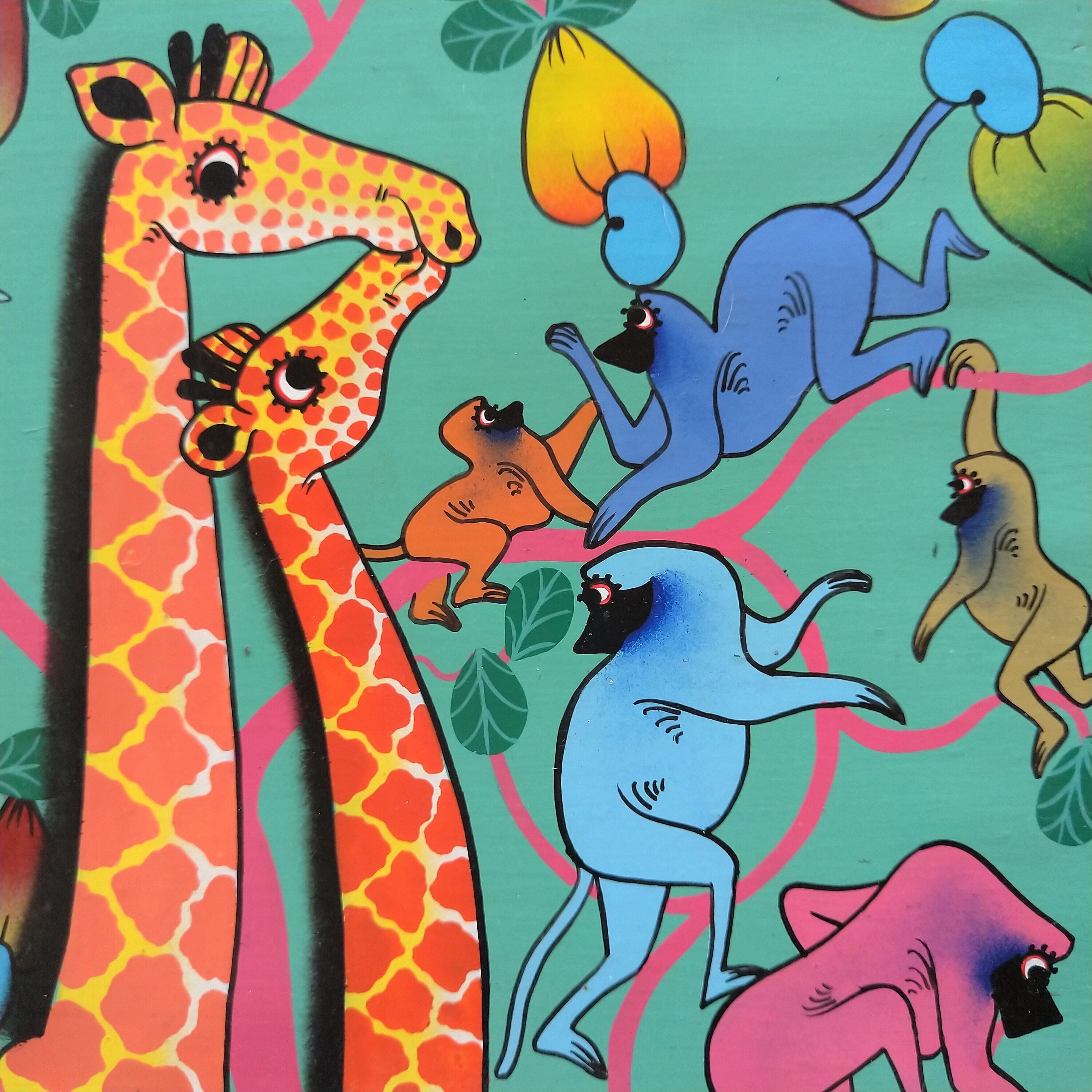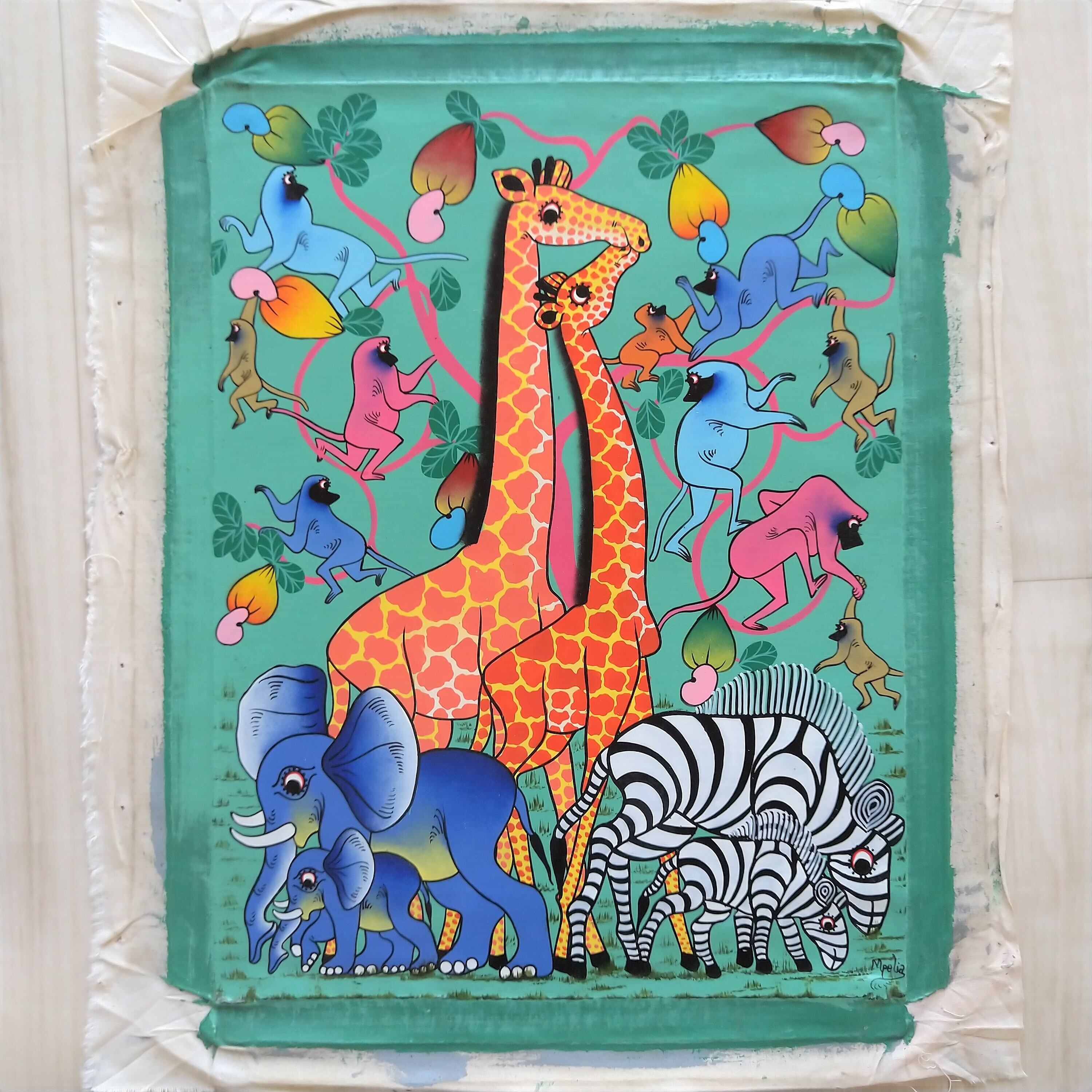 「キリン、シマウマ、ゾウのバックにはカシューナッツの木に登るカラフルなバブーン。色合いや動物たちの表情に、なんだか楽しくなる作品です。」