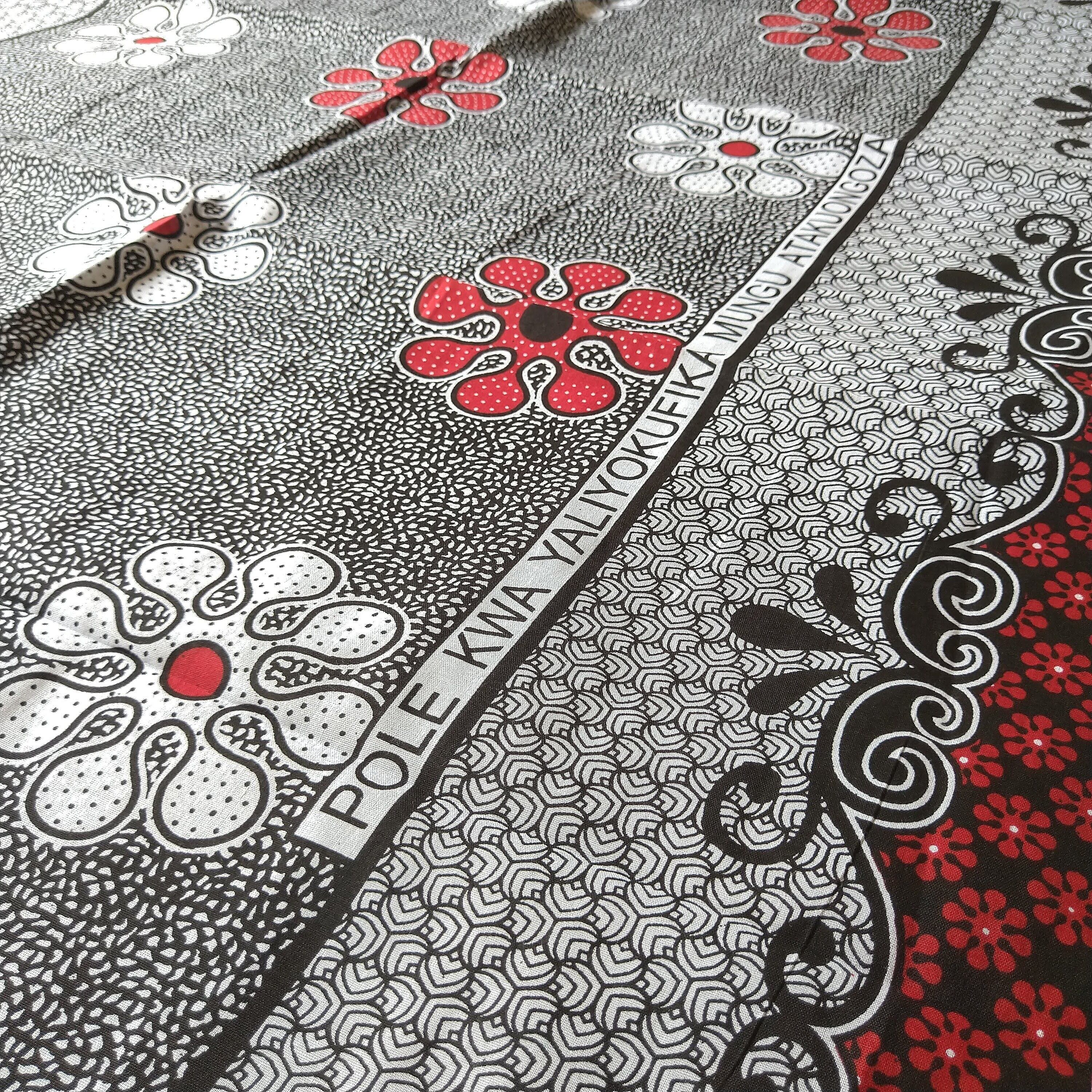 東アフリカ、タンザニア、ウガンダ、ケニアなどで多目的に使用されるカンガという布です。主に女性がエプロンやスカートのように腰に巻いたりして使っています(100を超える使用法があるのだとか!日本の風呂敷みたいですよね)。名前の由来は諸説ありますが、元になった布の柄がカンガ(ホロホロ鳥)だったとか。