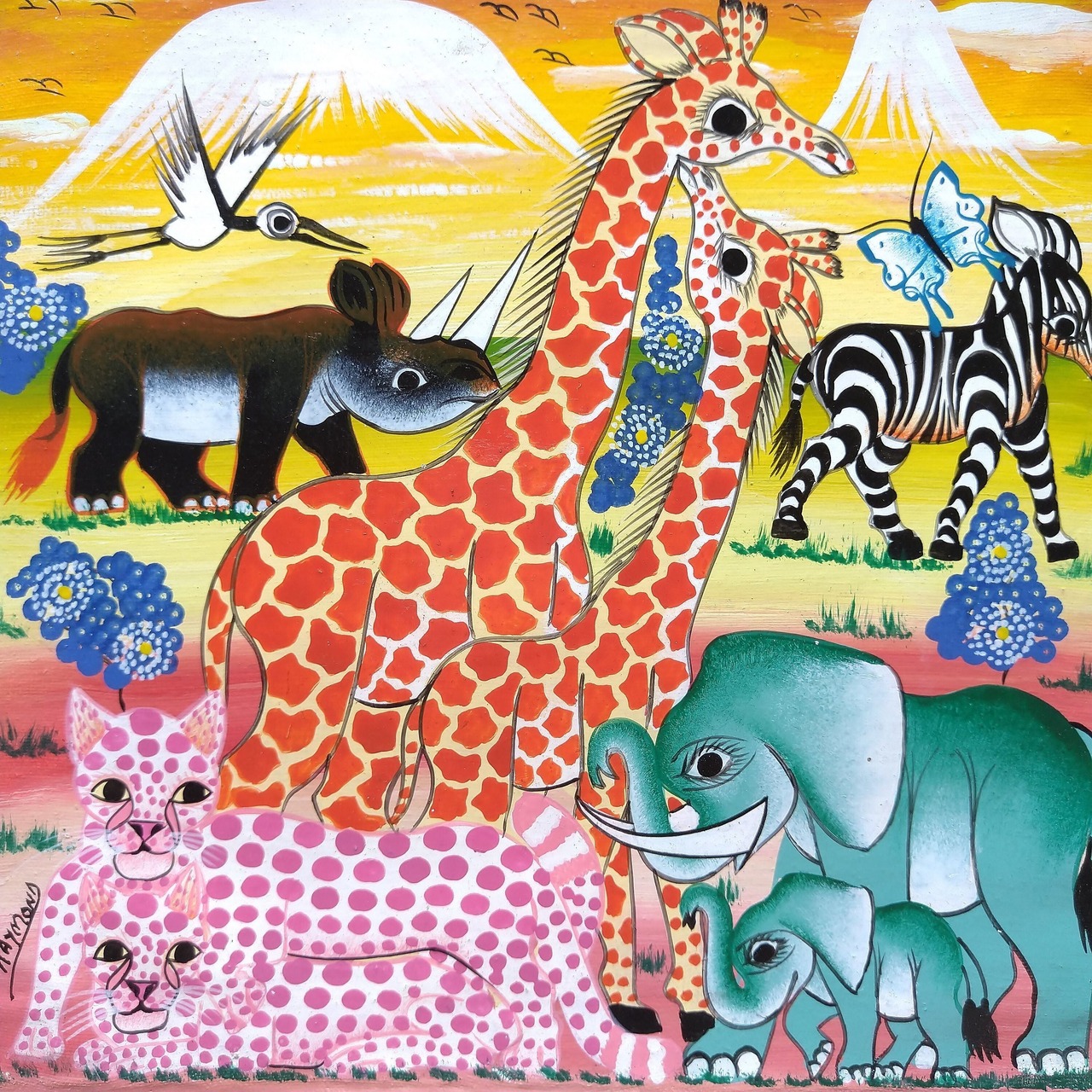 東アフリカ、タンザニアのポップアートです。主にアフリカの動物や植物、人々や風景、精霊などがモチーフとなり、エナメルペンキで描かれています。名前は創始者のエドワード・サイディ・ティンガティンガの名に因んでいます。