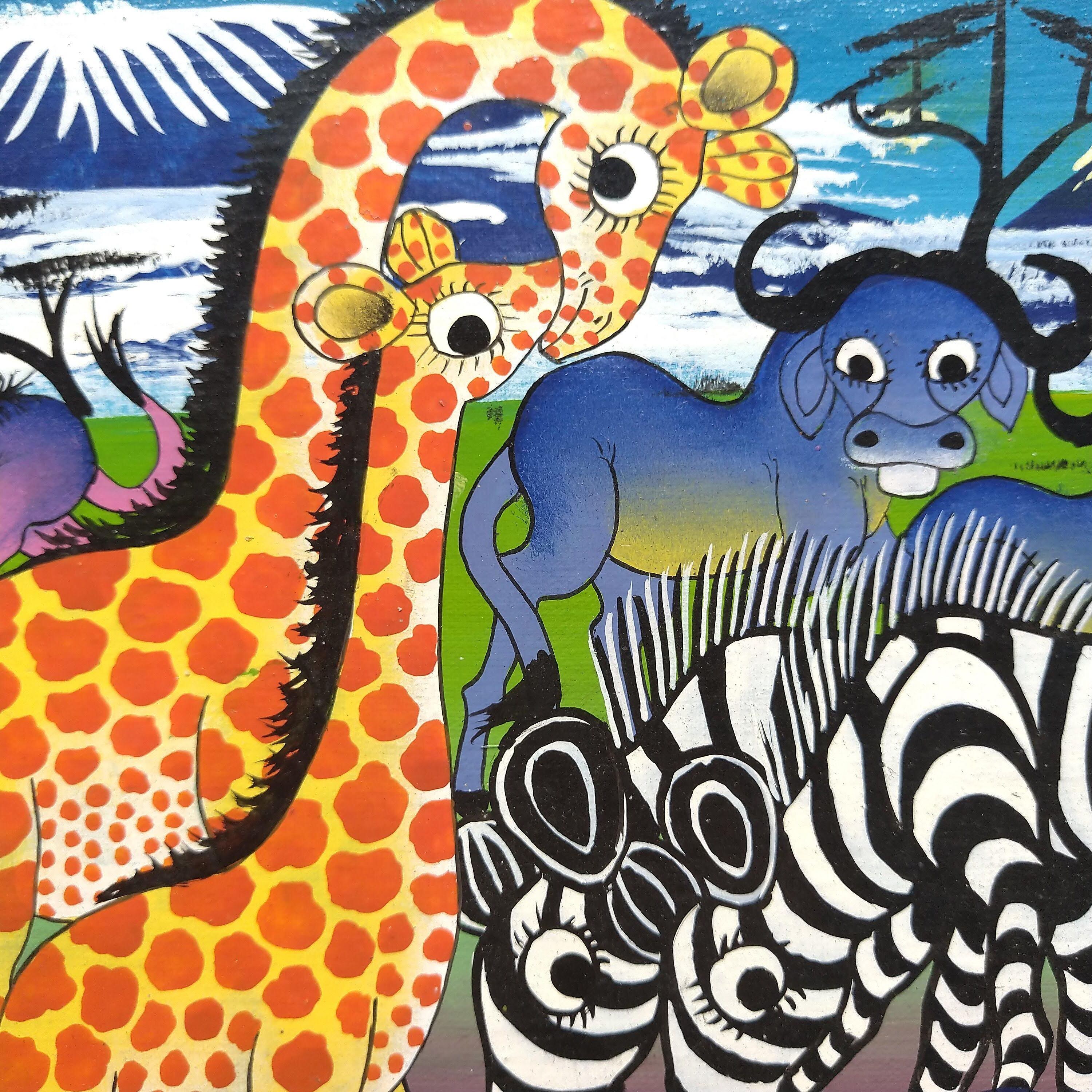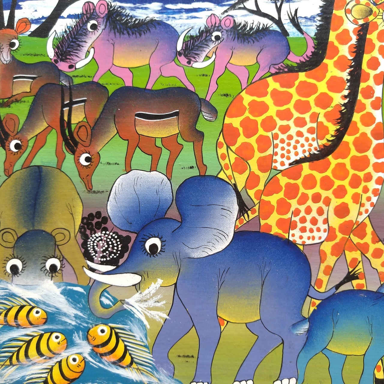東アフリカ、タンザニアのポップアートです。主にアフリカの動物や植物、人々や風景、精霊などがモチーフとなり、エナメルペンキで描かれています。名前は創始者のエドワード・サイディ・ティンガティンガの名に因んでいます。
