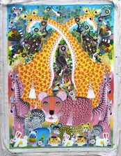 東アフリカ、タンザニアのポップアートです。主にアフリカの動物や植物、人々や風景、精霊などがモチーフとなり、エナメルペンキで描かれています。名前は創始者のエドワード・サイディ・ティンガティンガの名に因んでいます。