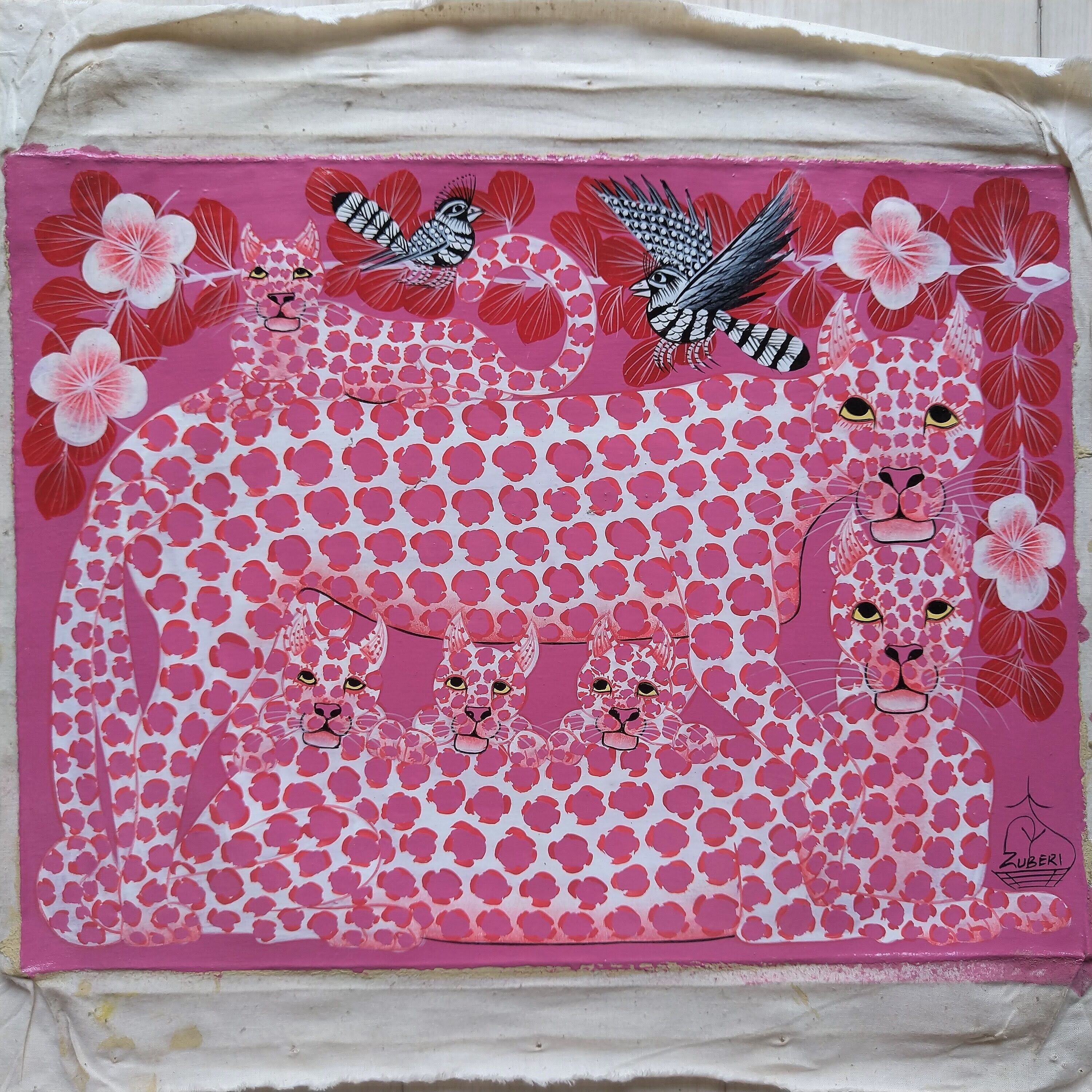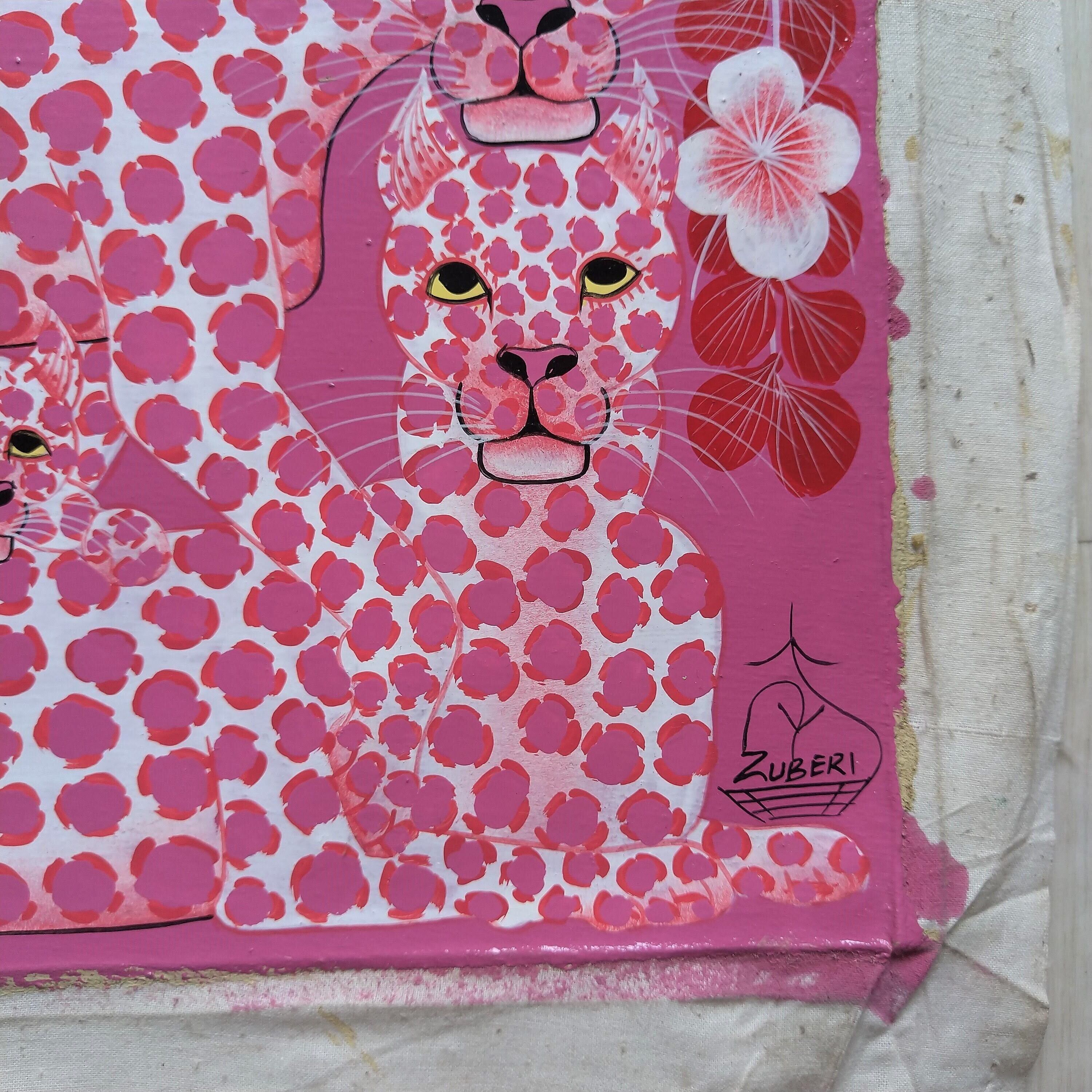 『 Pink Leopard family 4 』Medium-Tingatinga by Zuberi 30*40cm