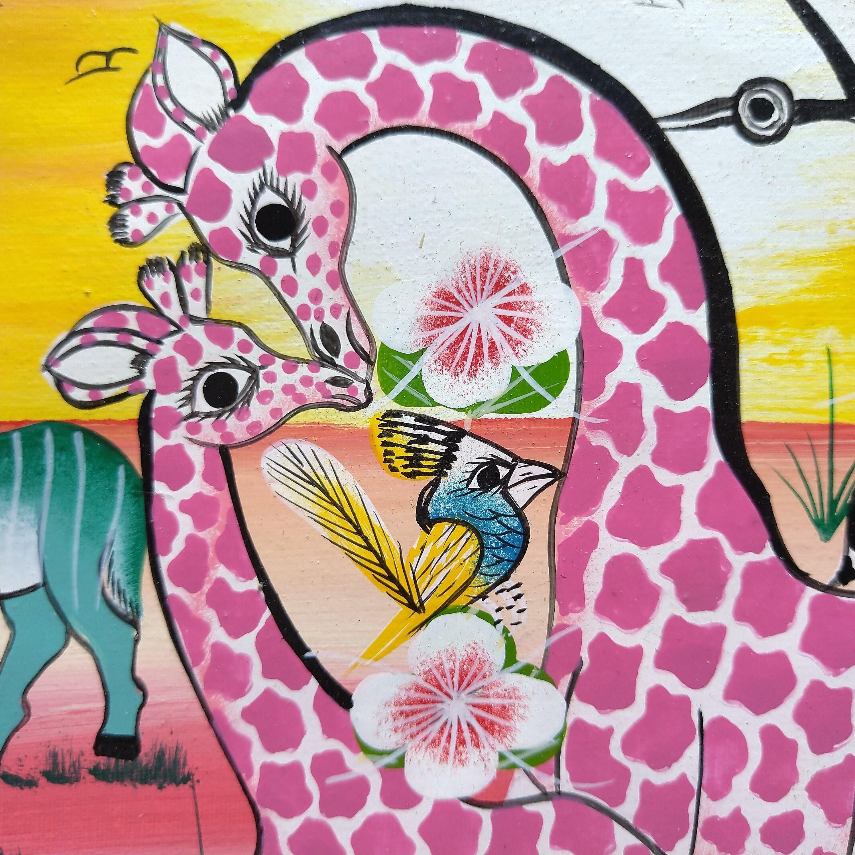 「サバンナの夕日を背景に集う動物たち。ピンクのキリンの親子が映えてます。原色とはまた一味違うファンタジックな色合いも素敵。お手頃サイズで小さな額にも入ります。」
