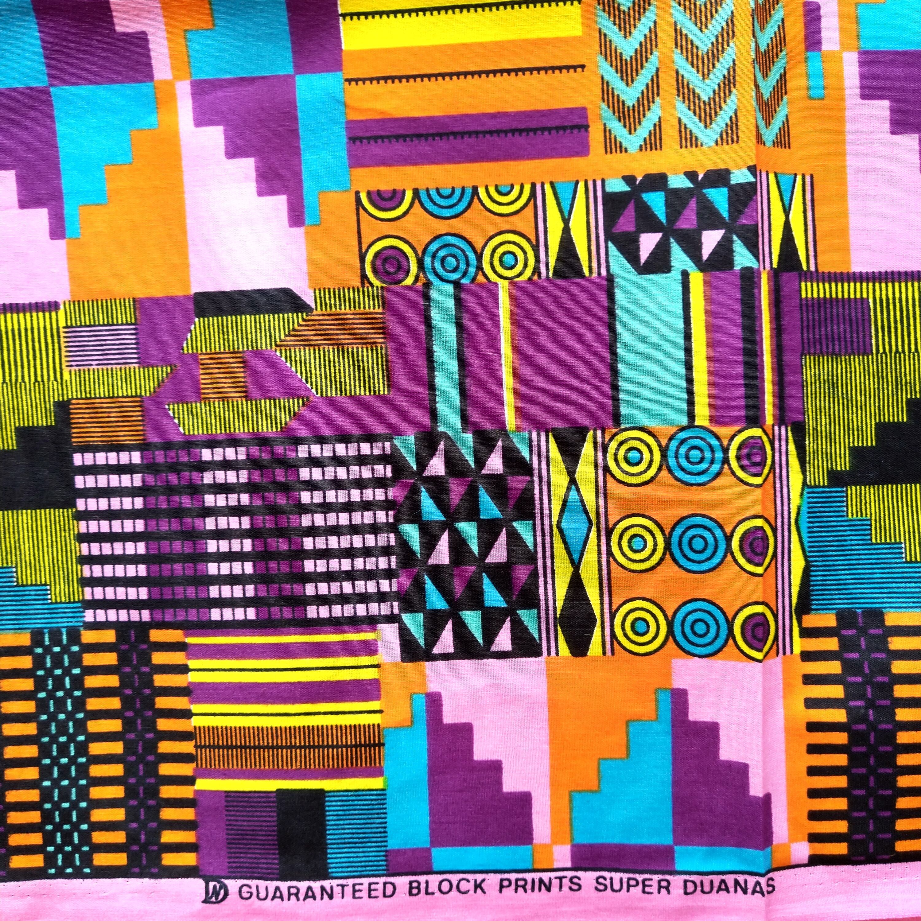 西アフリカ、中央アフリカからタンザニアに輸入されたワックスプリントです。タグ名は”DUANAS PRINTED BY ORIENTAR 100%COTTON 6 YARDS”