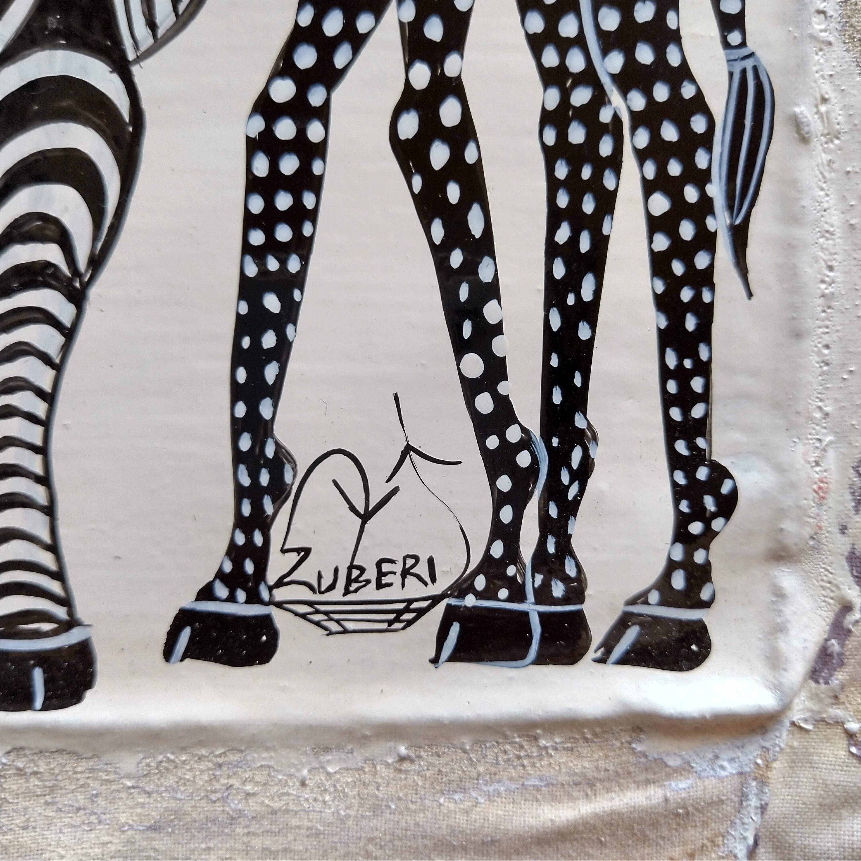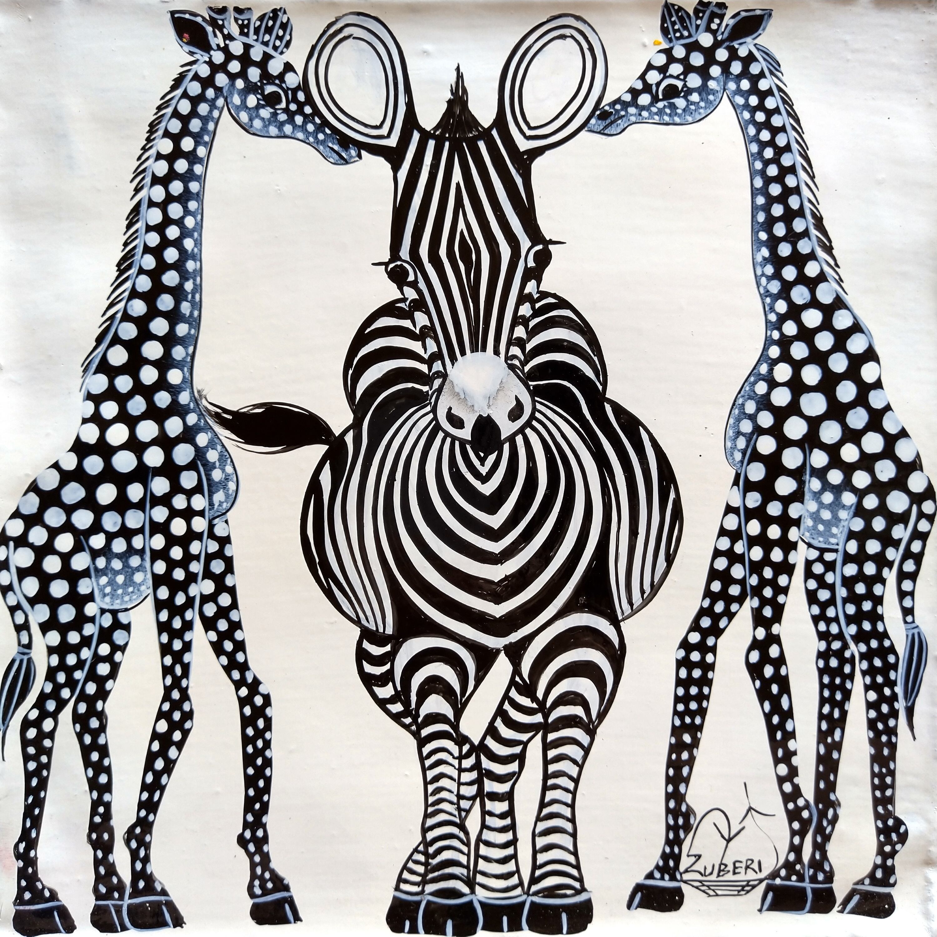 『 Giraffe and zebra B/W 3 』Small-Tingatinga by Zuberi 20*20cm