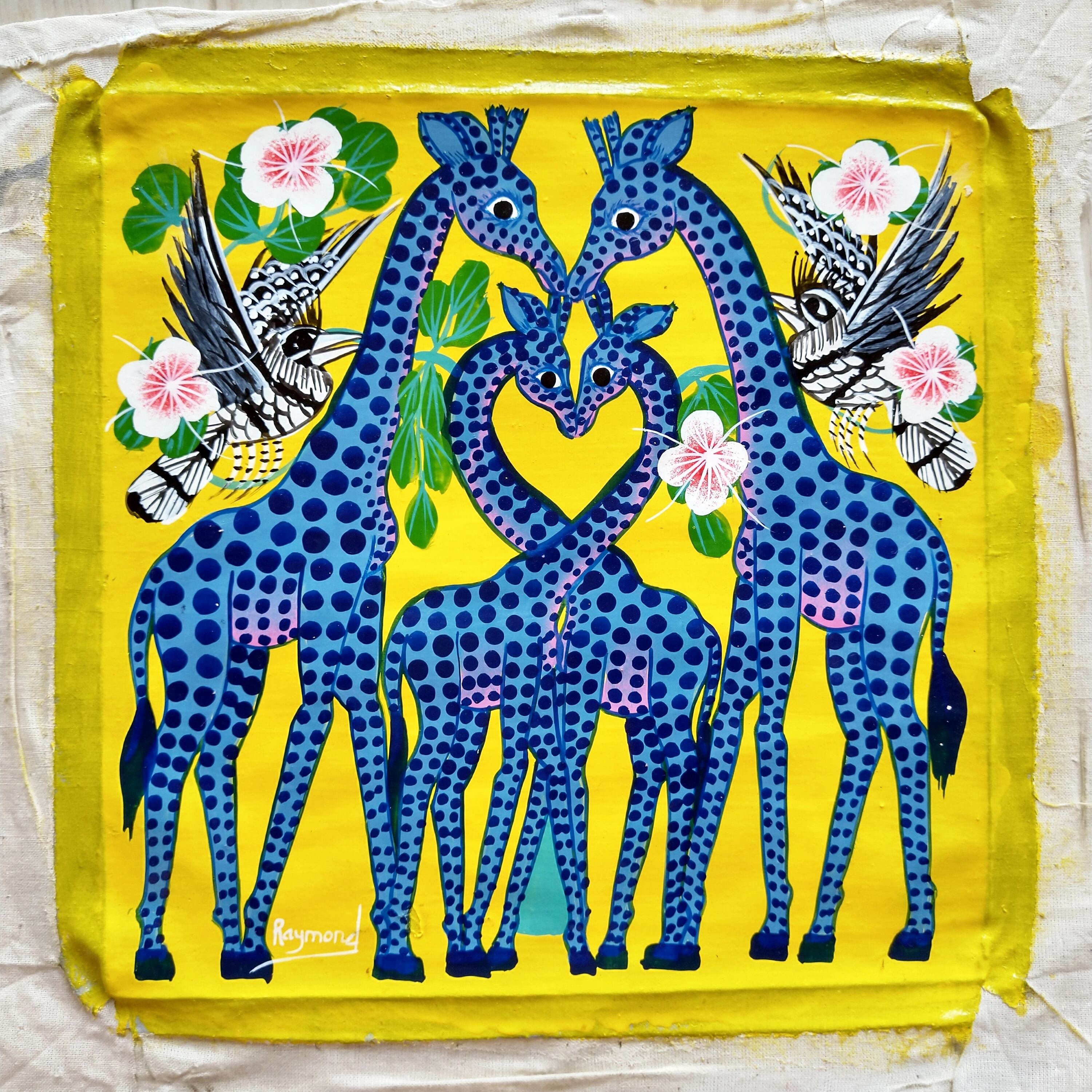 『 Blue giraff family in yellow 』Small-Tingatinga by Raymond 20*20cm