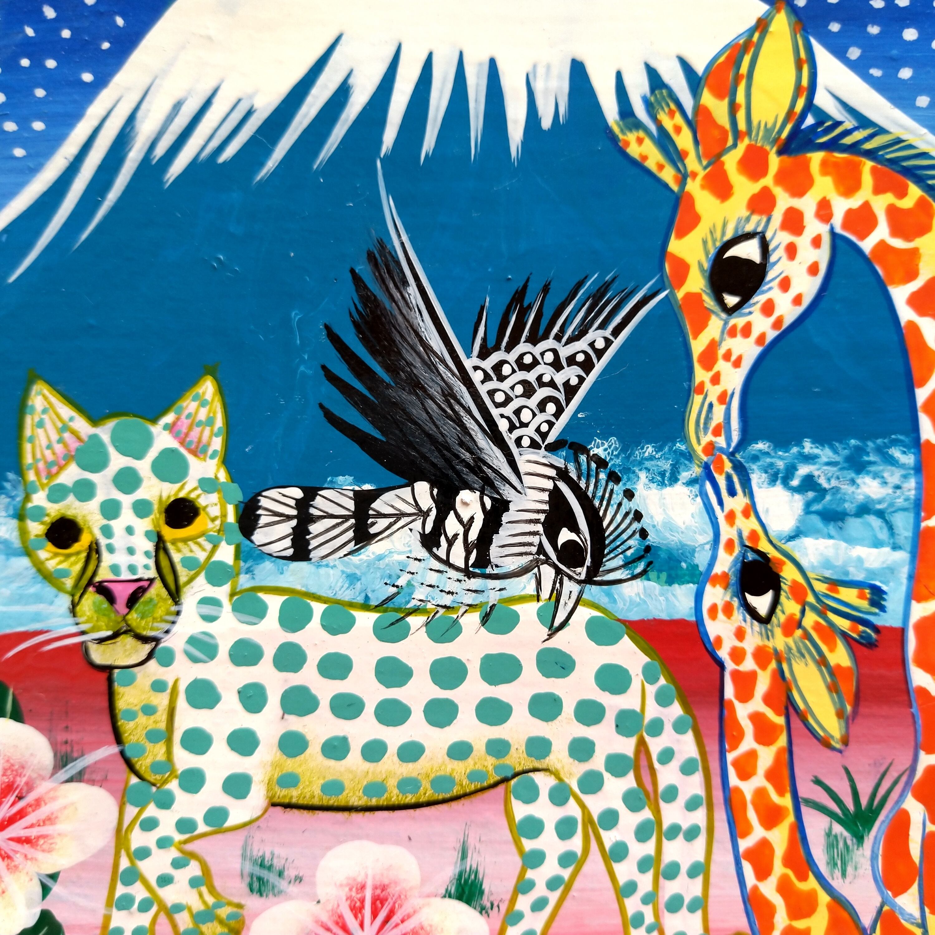 東アフリカ、タンザニアのポップアートです。主にアフリカの動物や植物、人々や風景、精霊などがモチーフとなり、エナメルペンキで描かれています。名前は創始者のエドワード・サイディ・ティンガティンガの名に因んでいます。