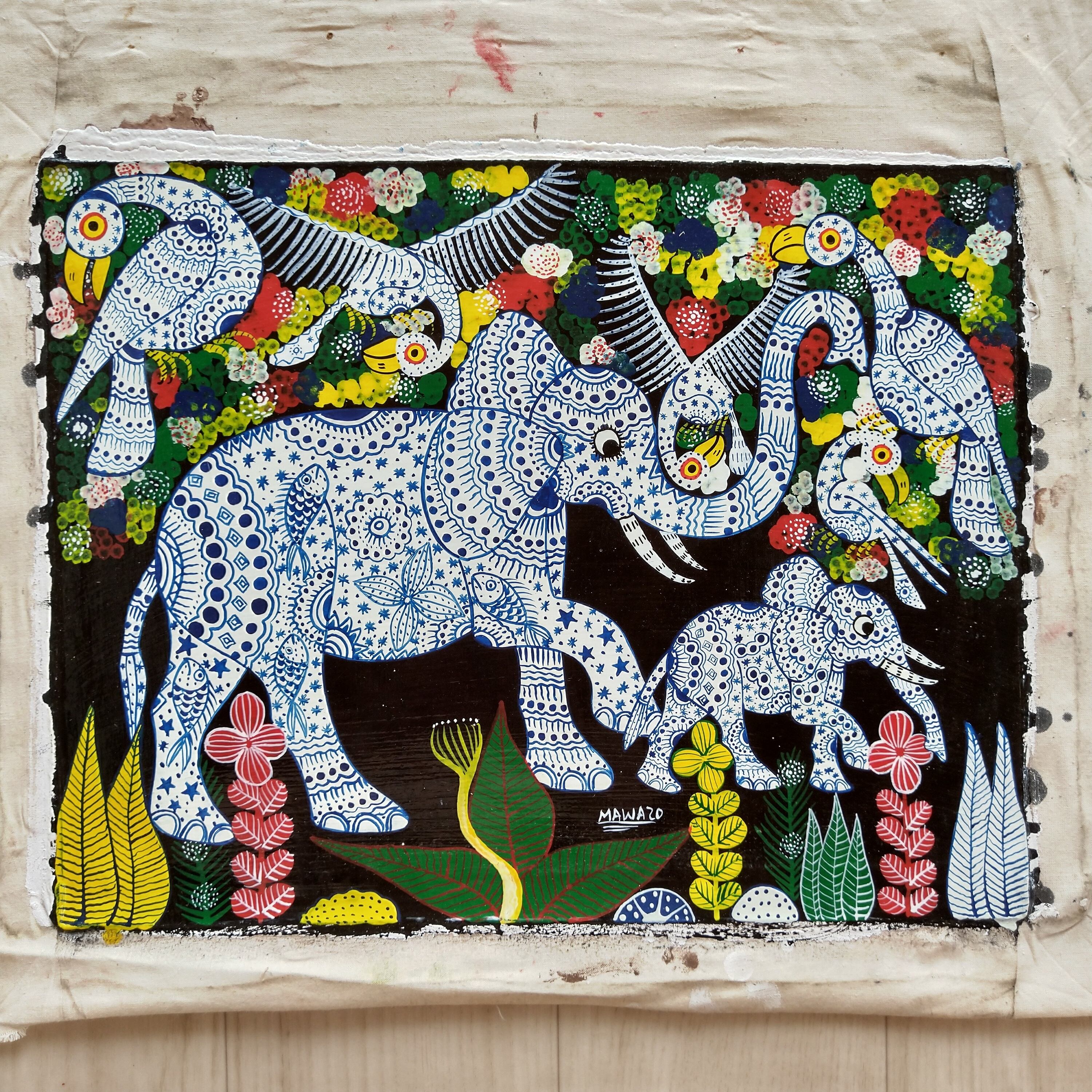 『 Patterned tembo family 』Medium-Tingatinga by Mawazo 27.5*35.5cm