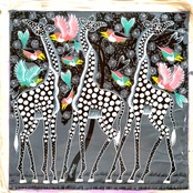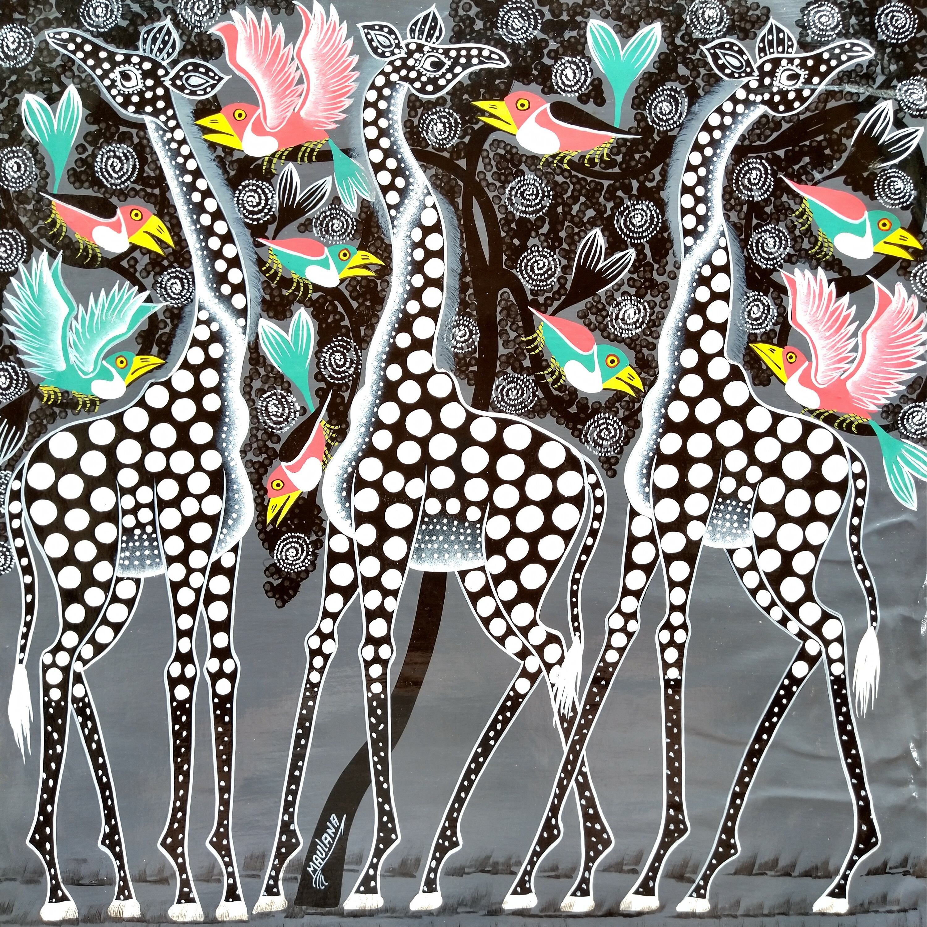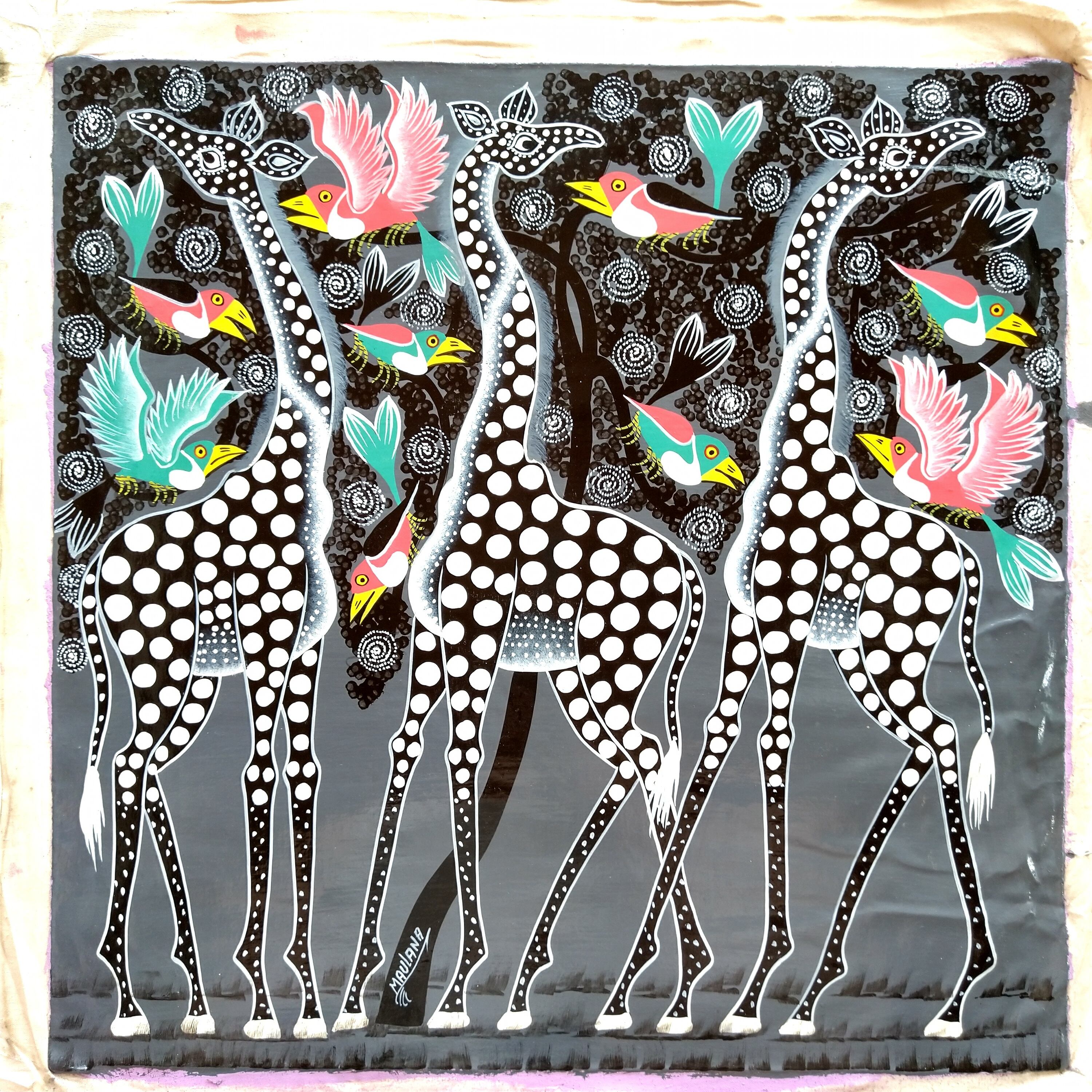 『 Twiga and birds in gray 』 Medium-Tingatinga by Maulana 45*45cm