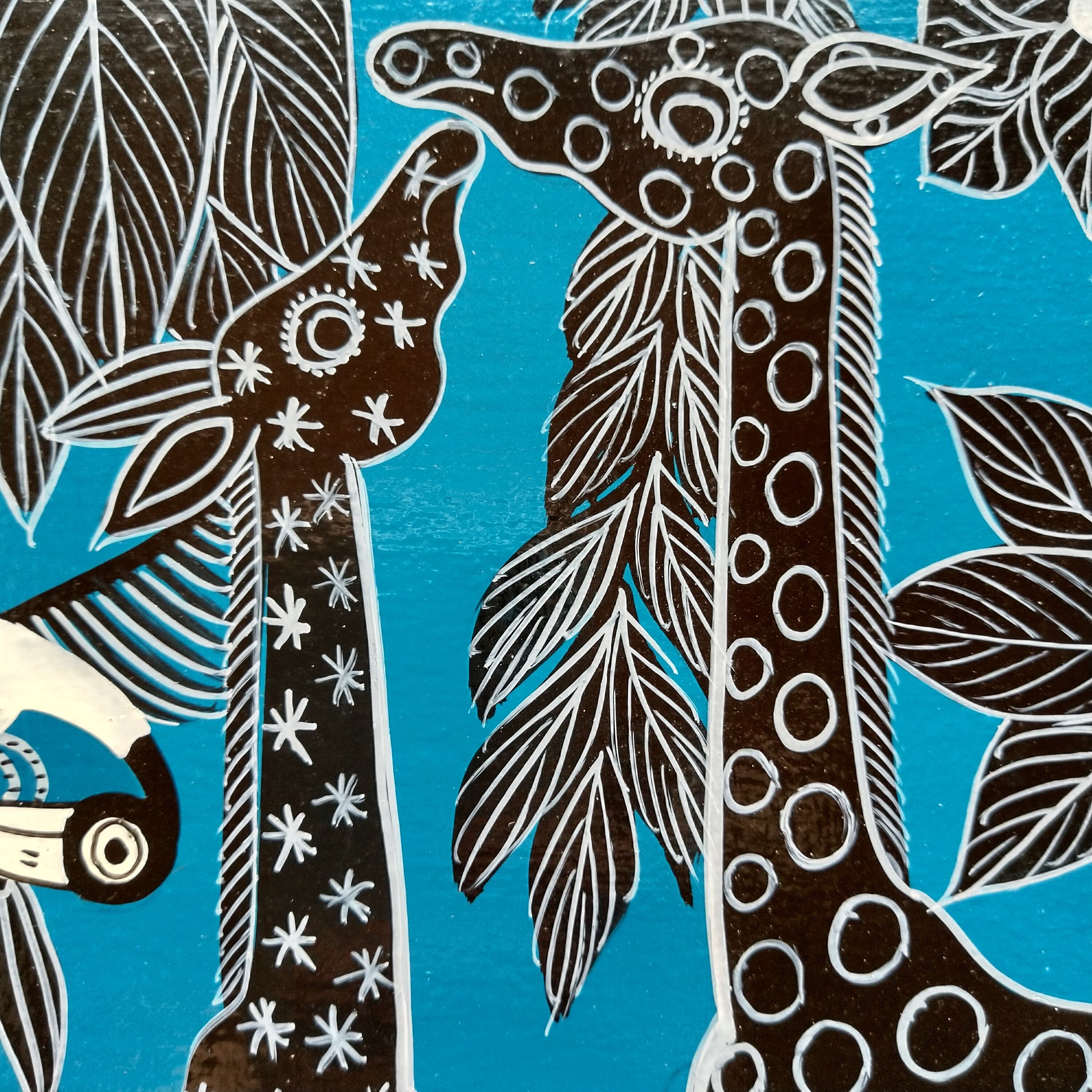 「ブルーの背景に四頭のキリン。みんながそれぞれ個性的な模様をしています!蝶や鳥も集っていますね。」