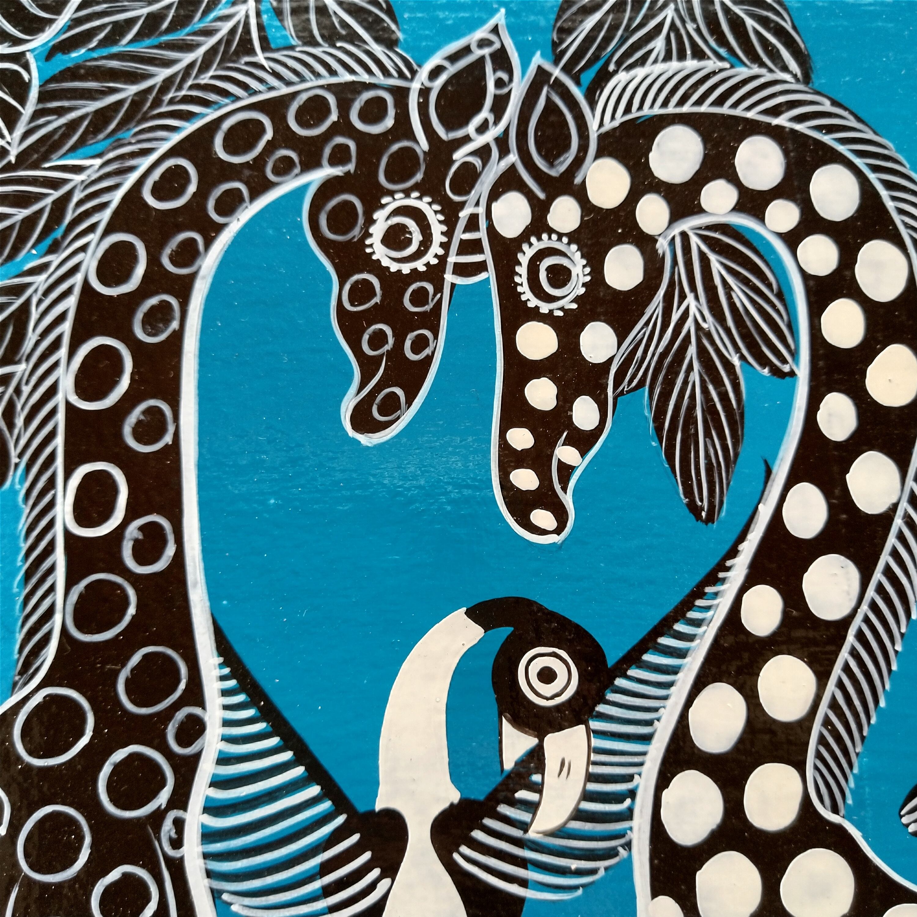 東アフリカ、タンザニアのポップアートです。主にアフリカの動物や植物、人々や風景、精霊などがモチーフとなり、エナメルペンキで描かれています。名前は創始者のエドワード・サイディ・ティンガティンガの名に因んでいます。