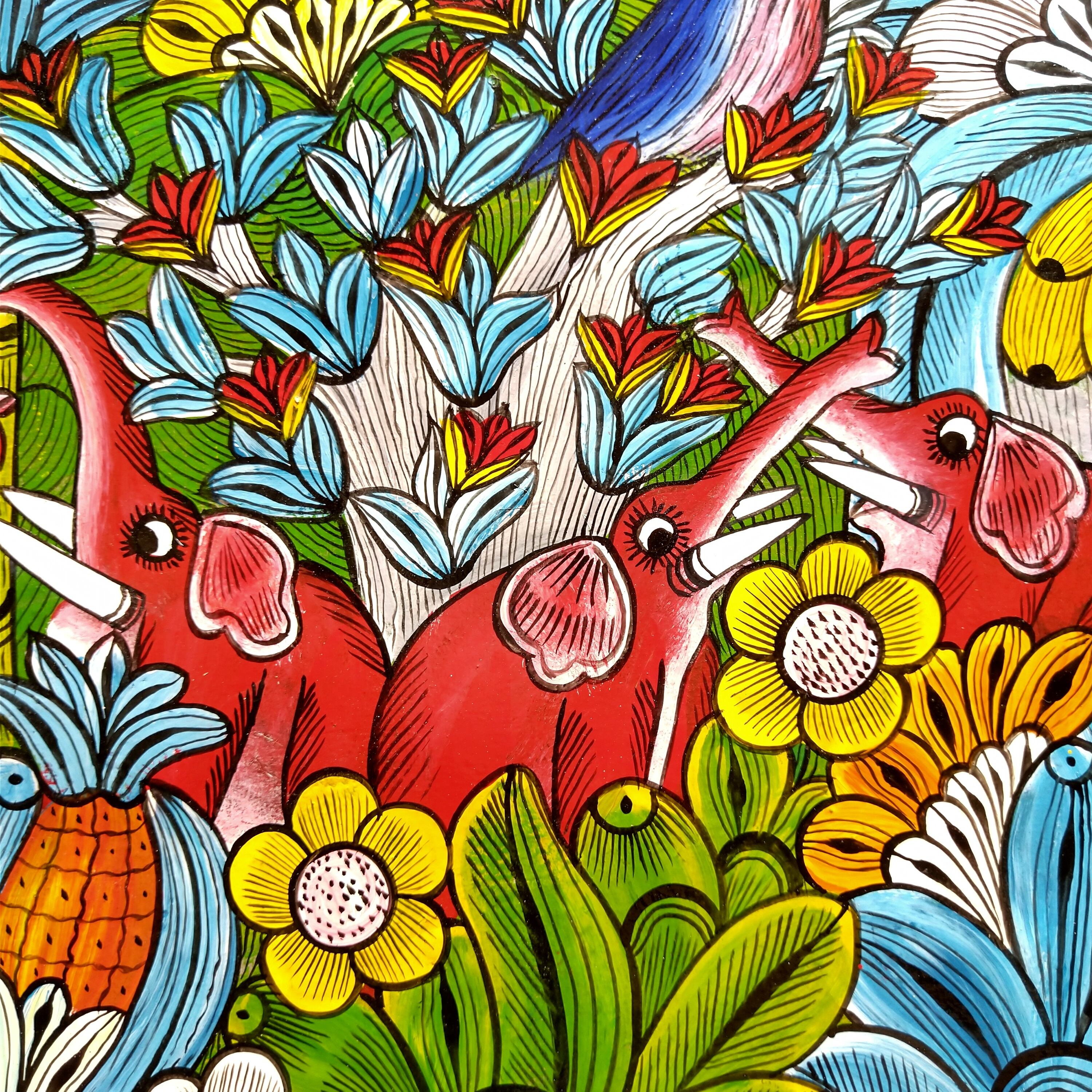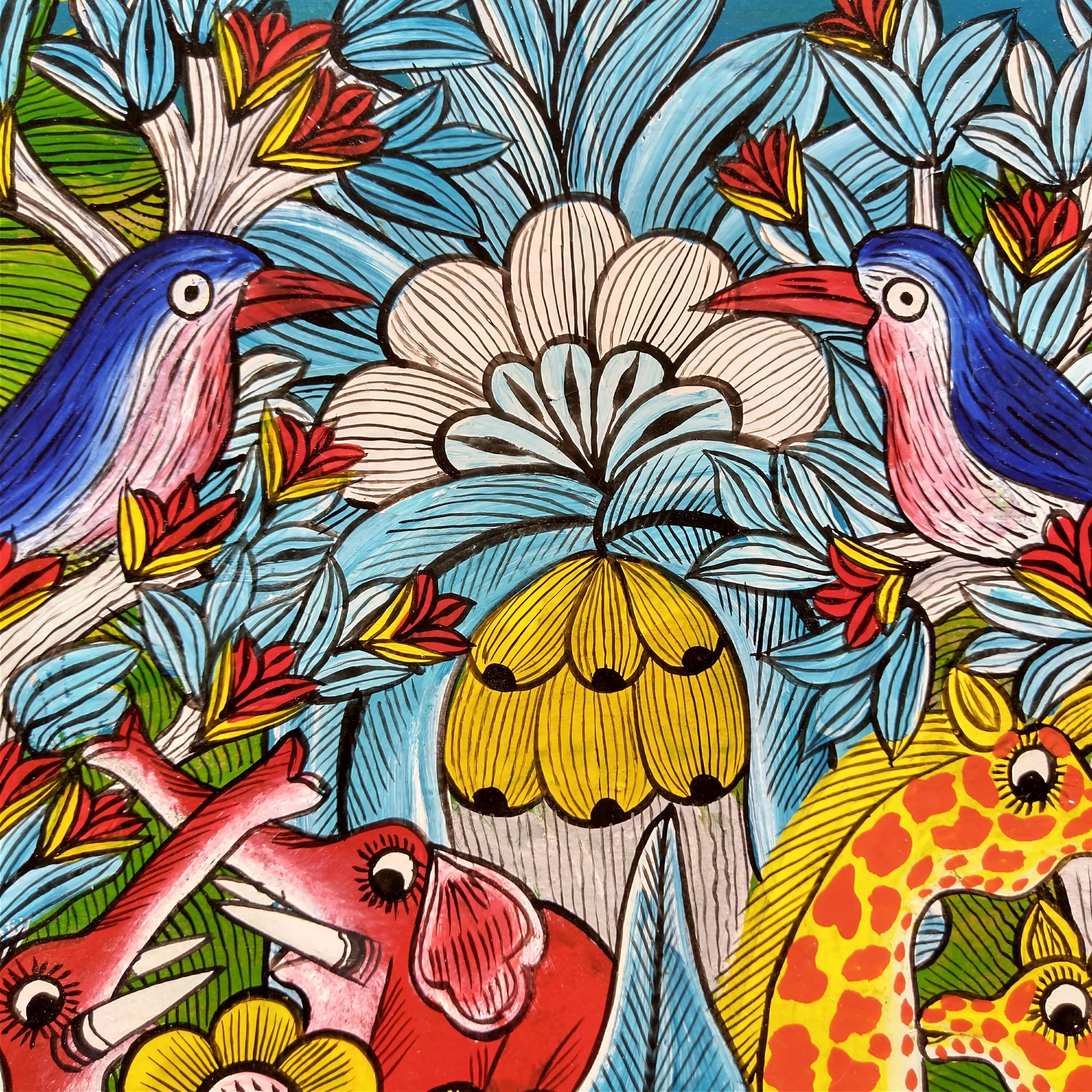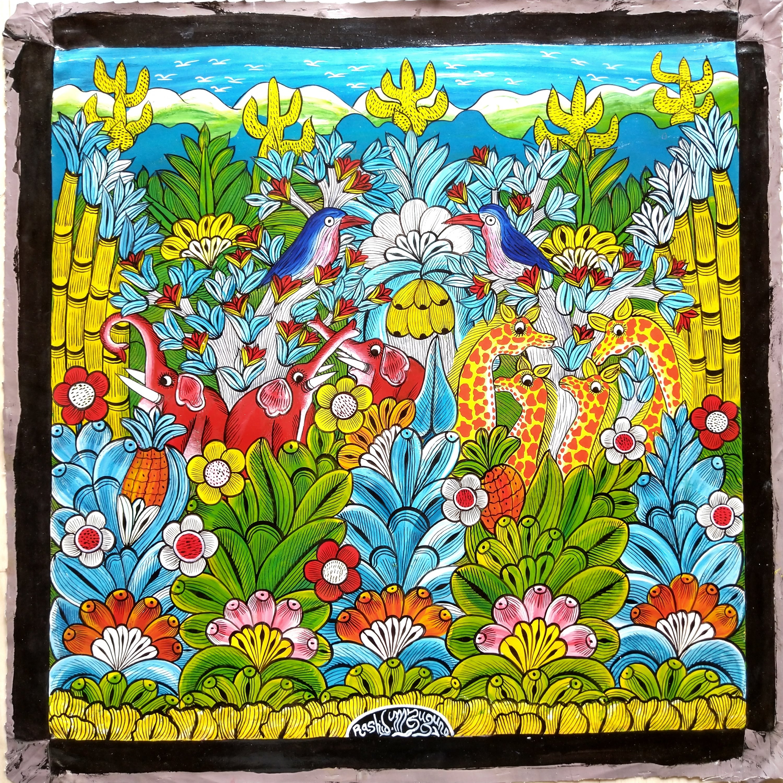 東アフリカ、タンザニアのポップアートです。主にアフリカの動物や植物、人々や風景、精霊などがモチーフとなり、エナメルペンキで描かれています。名前は創始者のエドワード・サイディ・ティンガティンガの名に因んでいます。